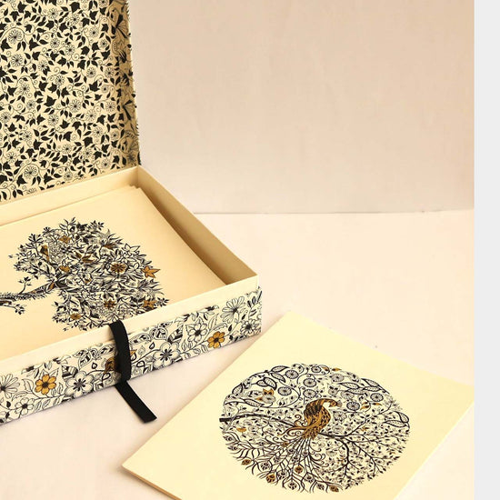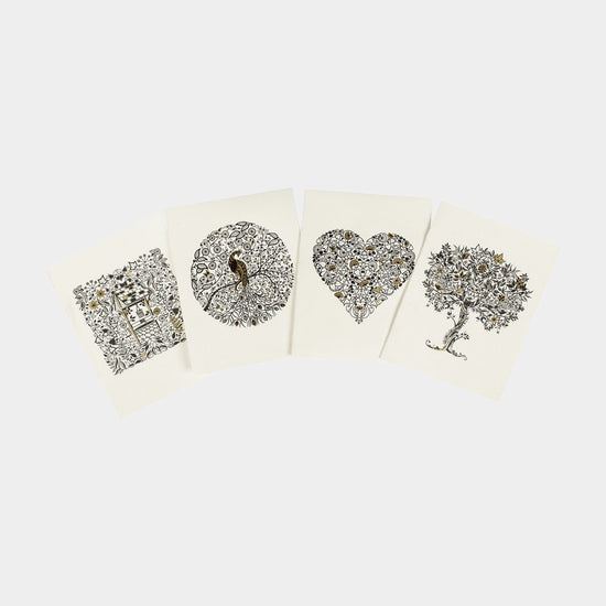 12 stylish, blank inside, notecards with decorated envelopes to suit a variety of occasions. The beautiful keepsake box includes four card designs; peacock, tree, well and heart, each decorated with gold detailing. There’s also the option of adding some super-fine colouring, if liked, although the cards look good enough to send just as they are..