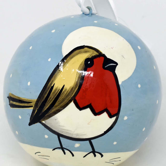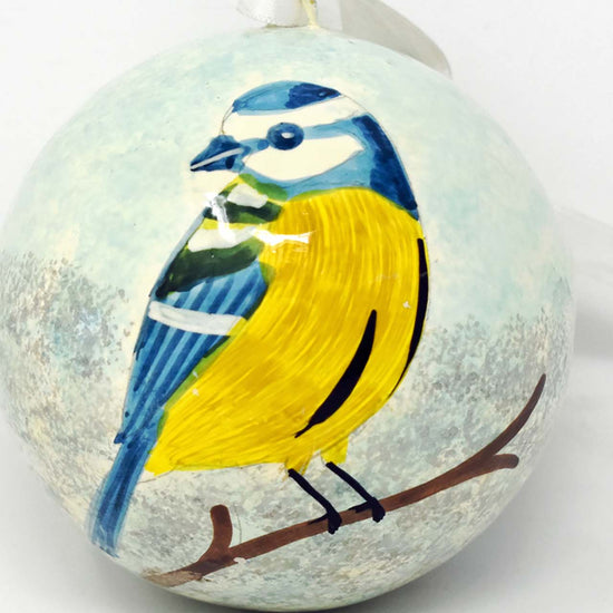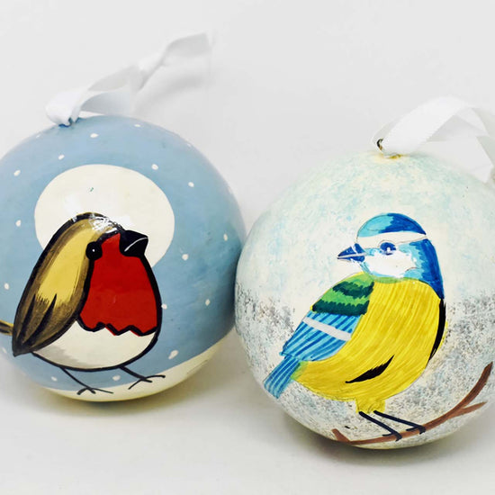 This pair of Robin and Blue Tit baubles makes a lovely festive gift for a bird watcher. Made in India at a Fair Trade workshop. Size: 7.5cm.