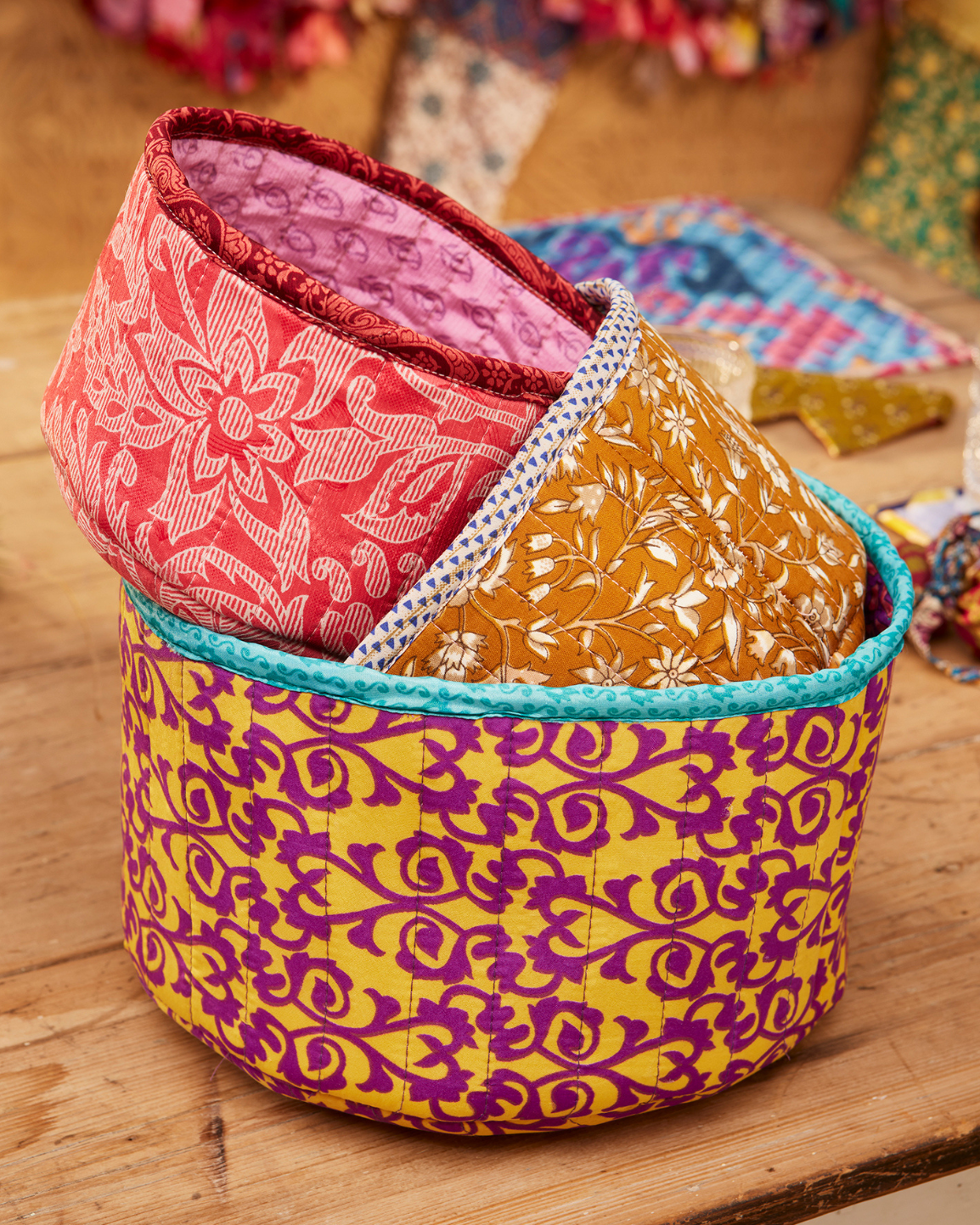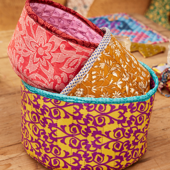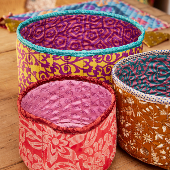 A beautiful set of three round baskets, handcrafted from recycled sari fabrics and finished with a soft quilted texture. Each basket showcases a striking combination of complementary sari designs across the outer fabric, lining, and handles, making every set truly unique.