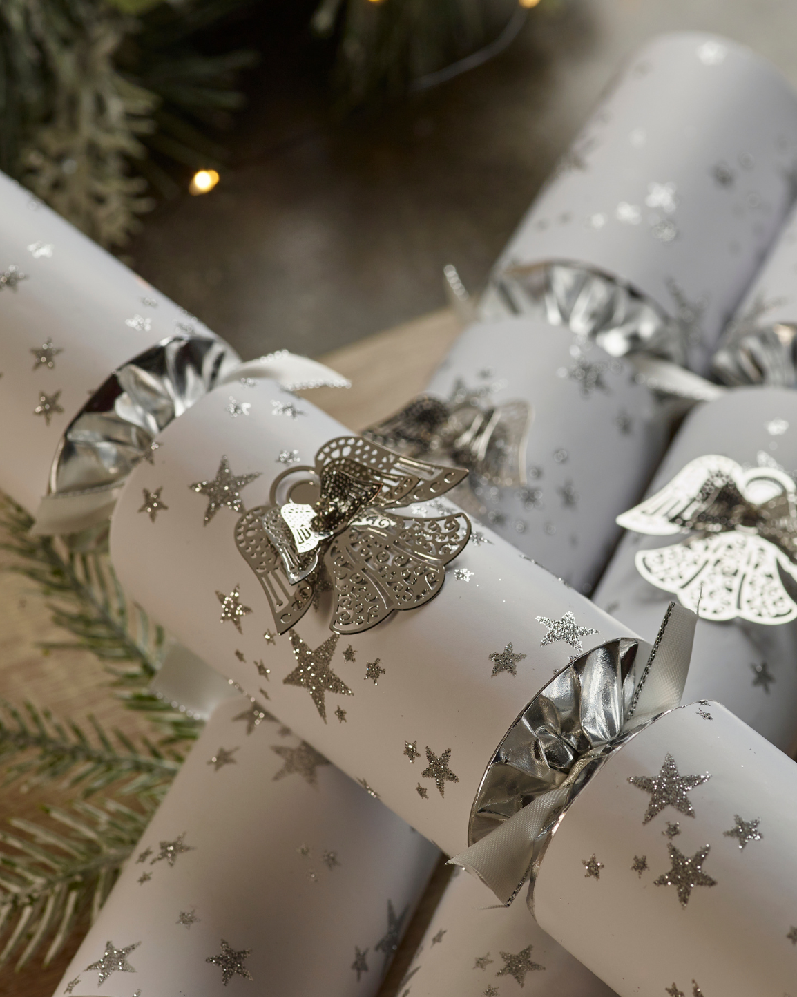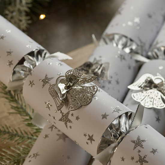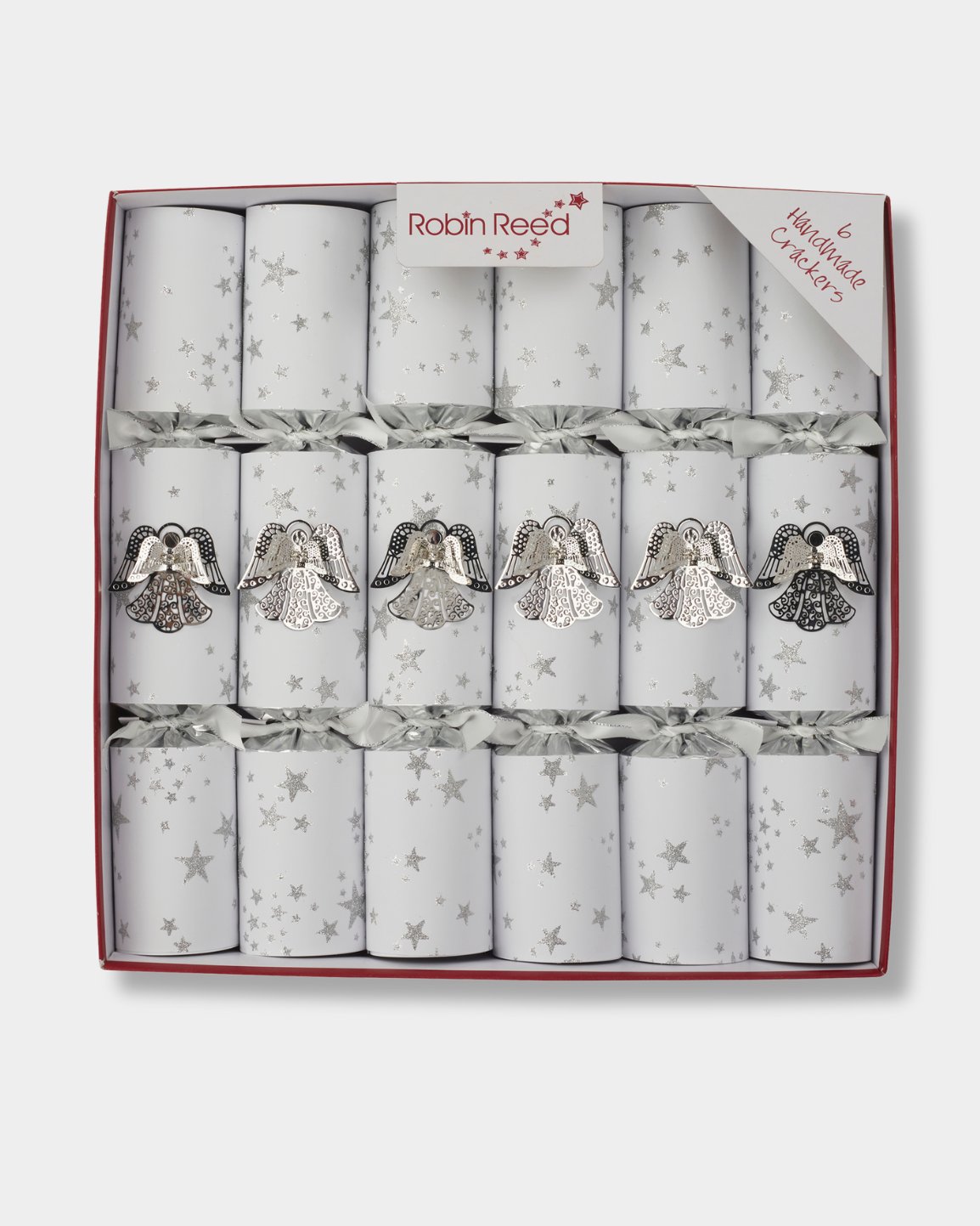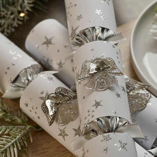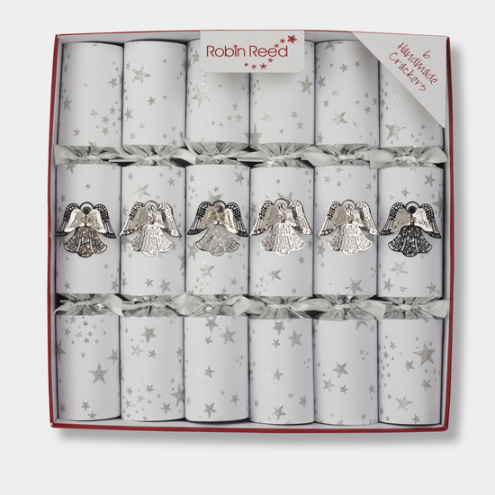 Beautiful white and silver crackers with a festive Angel motif. Contains a selection of plastic-free gifts, snap, joke and paper crown.