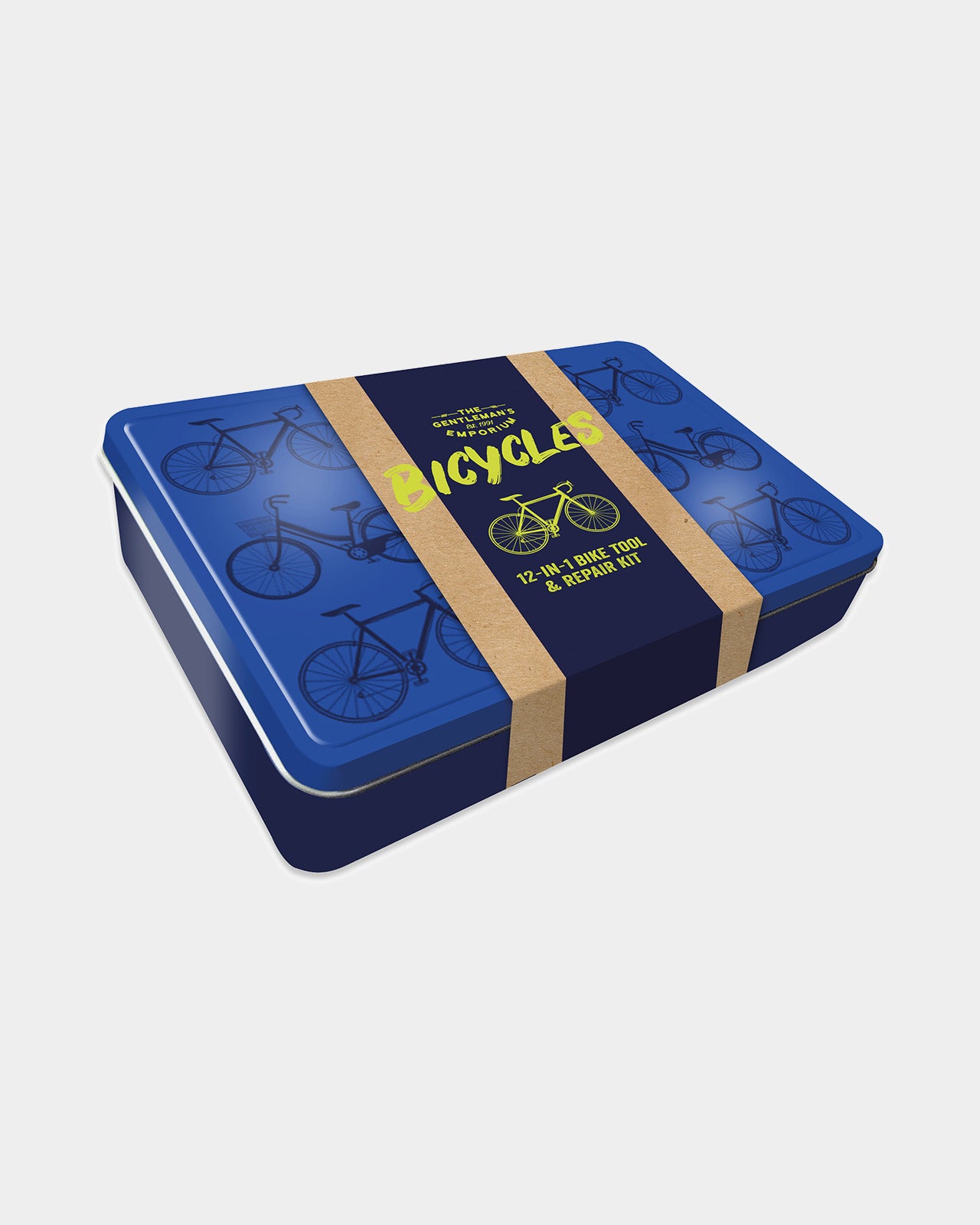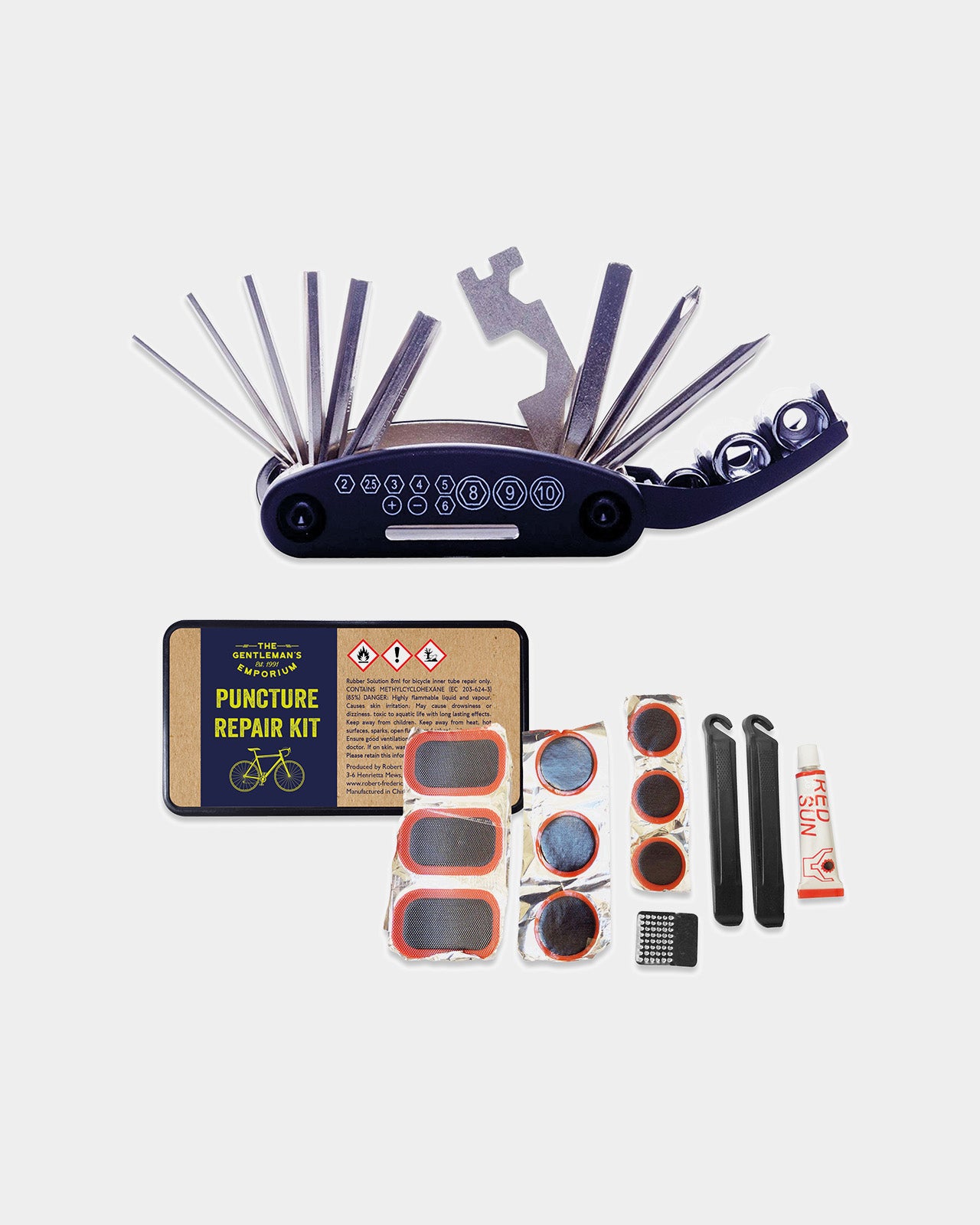 Everything a cyclist needs in one neat tin. This repair kit includes a 12-in-1 bike multi-tool plus all the essentials for fixing a flat: patches, tyre levers, glue, and a scrubber.
