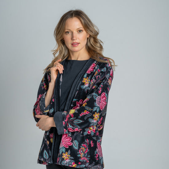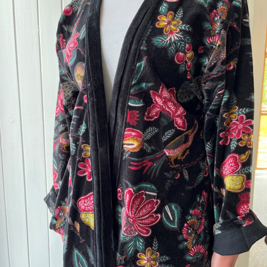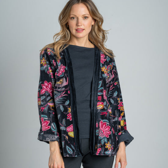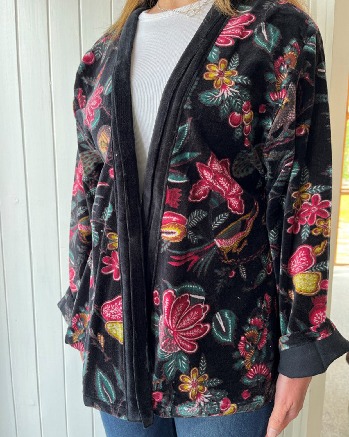 Relaxed fit velvet jacket in an exuberant botanical prints. The perfect way to dress up jeans or set off an outfit with a bold statement piece. Size: 70cm from collar to hem. Dry clean only. Fits UK size 8-14.