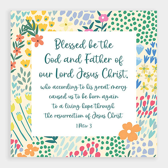 Bible verse: On front: Blessed be the God and Father of our Lord Jesus Christ, who according to his great mercy caused us to be born again to a living hope through the resurrection of Jesus Christ. 1 Peter 3 (W.E.B.)