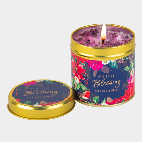 Bless your loved ones with this festive plum pudding scented candle tin with notes of: lily, rose, mandarin, ginger and vanilla. Each candle is topped with biodegradable glitter and presented inside a gold-coloured tin with festive wrap design.