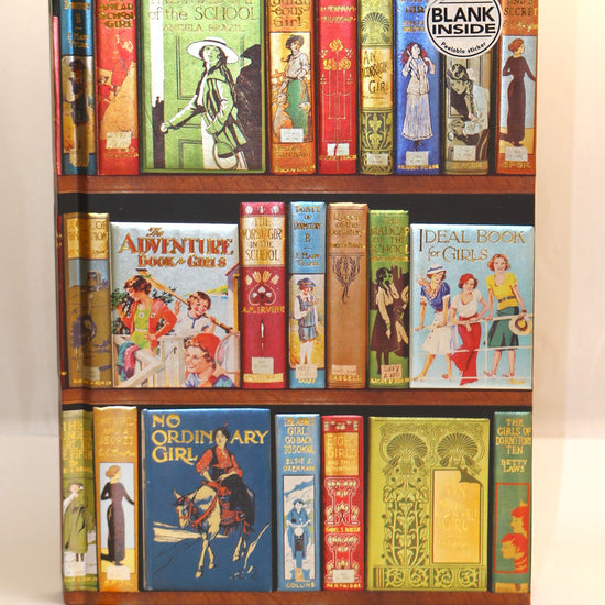 A beautiful unlined, blank journal with a high quality foiled cover showing rows of 1930s adventure books for girls.