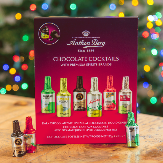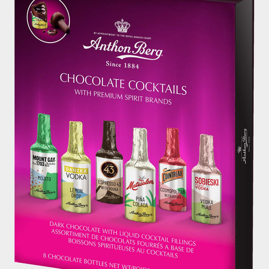 8 chocolate bottles with premium cocktails in liquid centres. 125g.