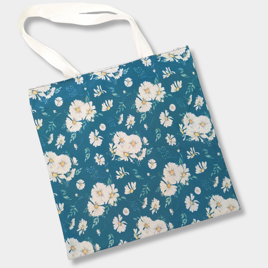 Lightweight and practical teal shopper with white dainty daisies design. Fully lined, with zip top and white canvas carry handles. Easy folds for storage. Size: 40 x 40cm