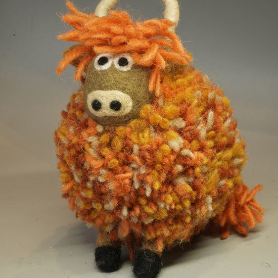 Hand felted 100% wool ornament. Cute colourful highland cow standing decoration. Fair trade and Handmade in Nepal.