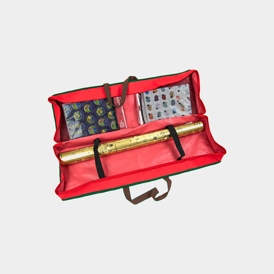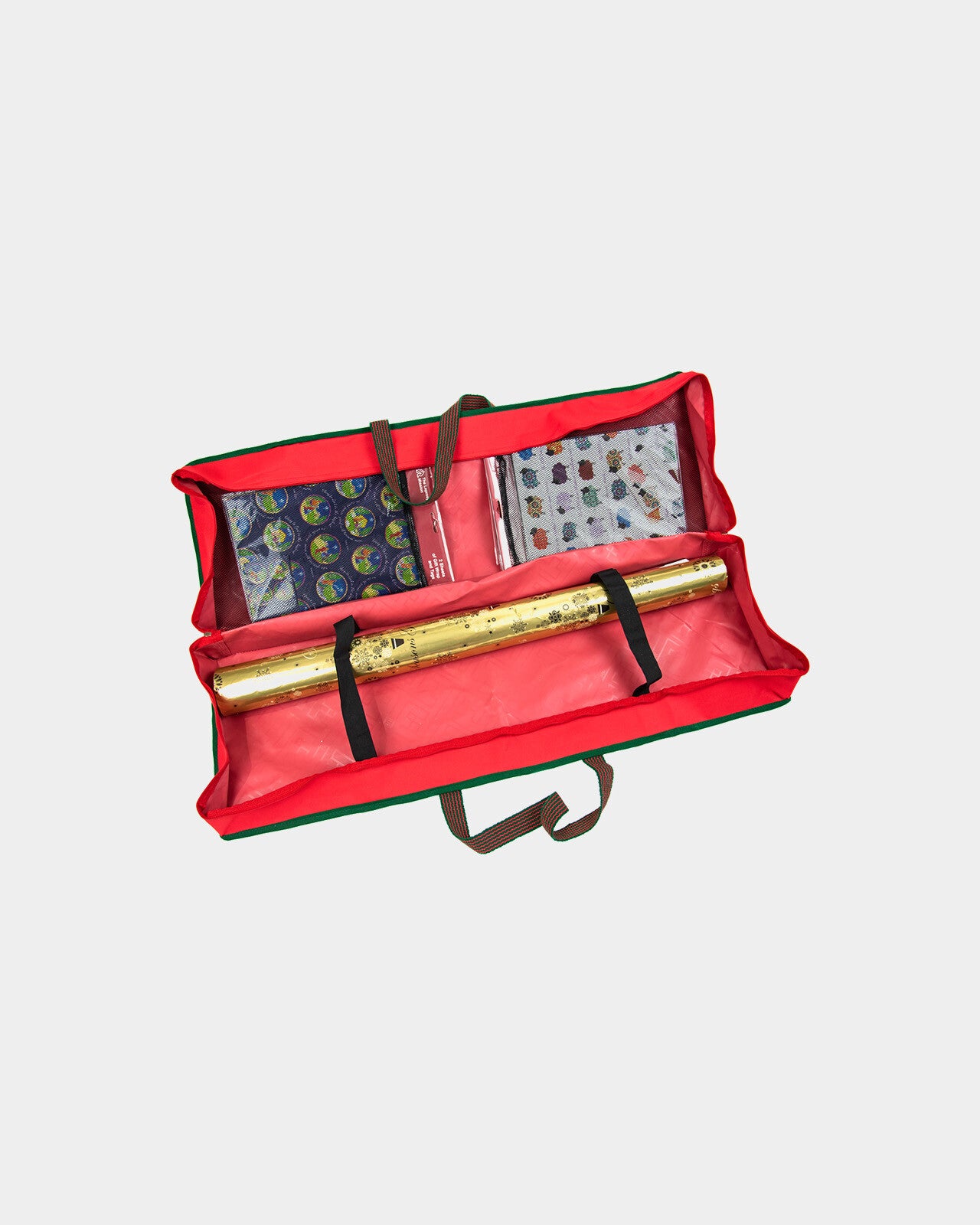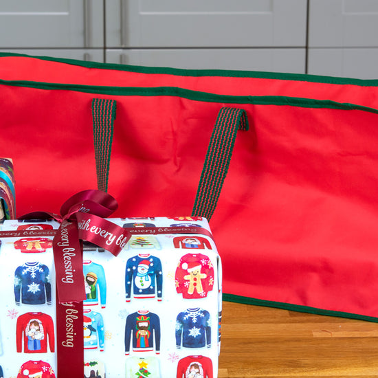 Store your gift wrap neatly in one place with this wipe clean tidy bag made by two collaborating artisan groups. The ideal size for storing rolls of wrap with two velcro straps to keep up to six rolls in place. Features handy mesh pockets for storing all of your ribbons, bows, sheet wrap and tags and is fully zipped with strong cotton hand-loomed handles for easy lifting. Made from strong woven polyethylene material. Supplied by MESH, India.