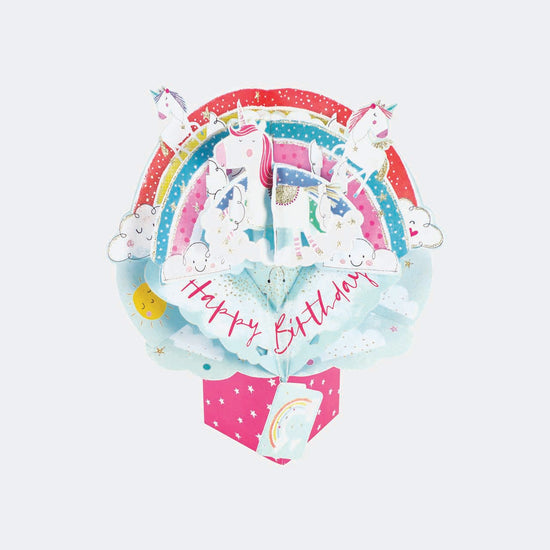 When removed from their envelope this fun Unicorn Birthday card pops up into a stunning 3D arrangement. Includes spaces to write your message on the back of the card or the gift tag. Sold singly.