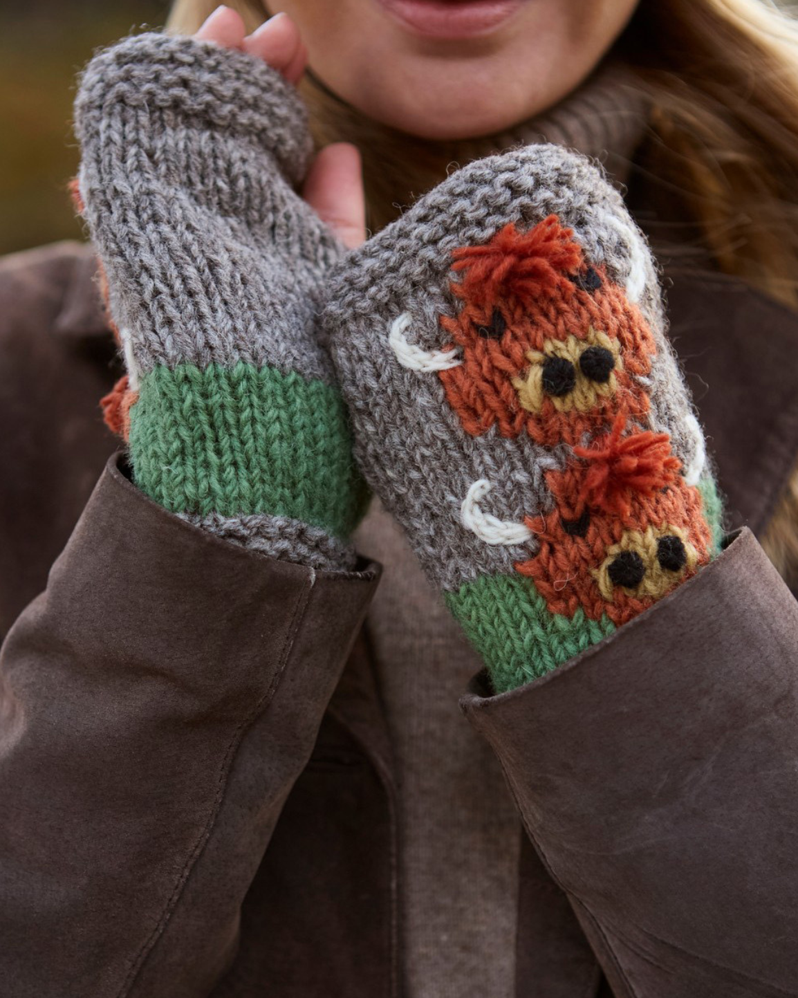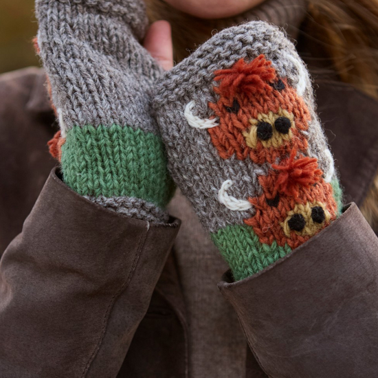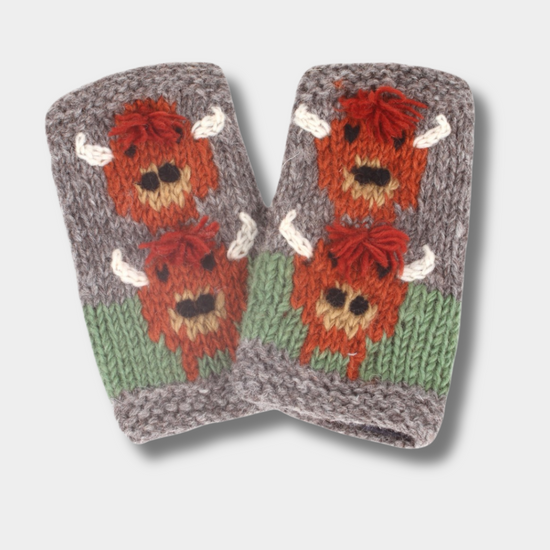 These Highland Cow Handwarmers keep your hands and wrists covers and your fingers free to use. This gorgeous design has been knitted by hand and finished with hand embroidered details by the talented artisans of Pachamama Nepal. 100% wool with cotton jersey lining. One size designed for women. Fair Trade and Handmade in Nepal.