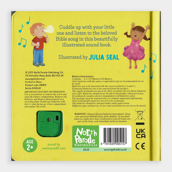 Little ones will love pressing the green button to hear the familiar tune while turning the pages to sing along with the words and enjoy the bright, cheerful illustrations. Includes on/off button.