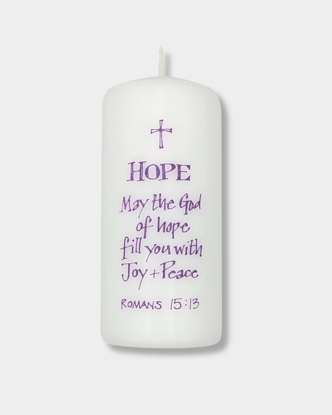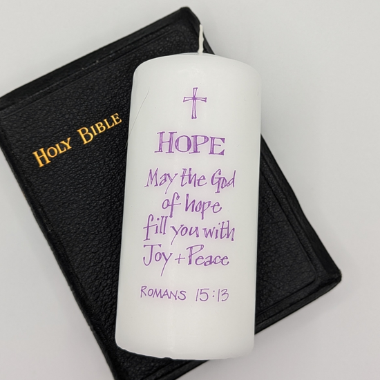 An encouraging candle etched with the word Hope and a verse from Romans 15:13: May God of hope fill you with joy and peace. Decorated with a simple cross to tie the message beautifully together. Whether a gift for another or for yourself, its a gentle reminder of hope and grace.