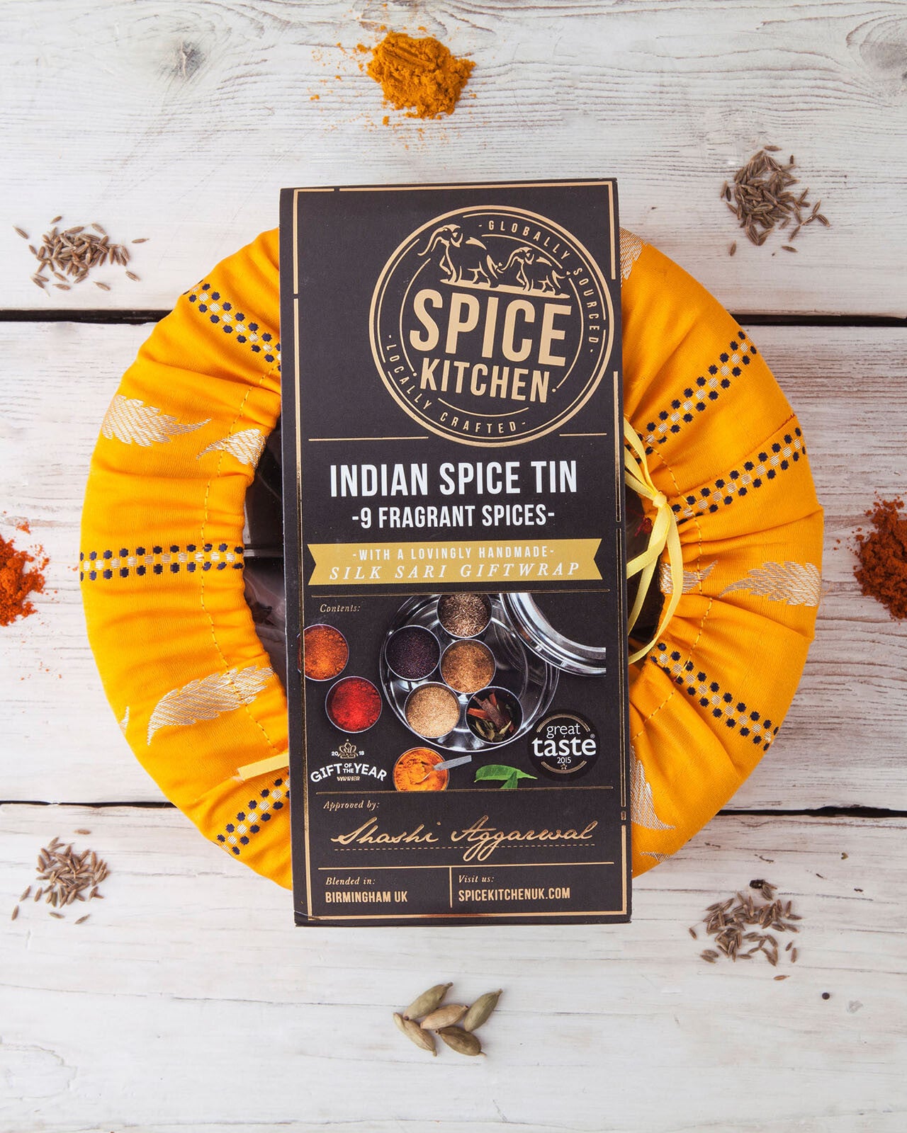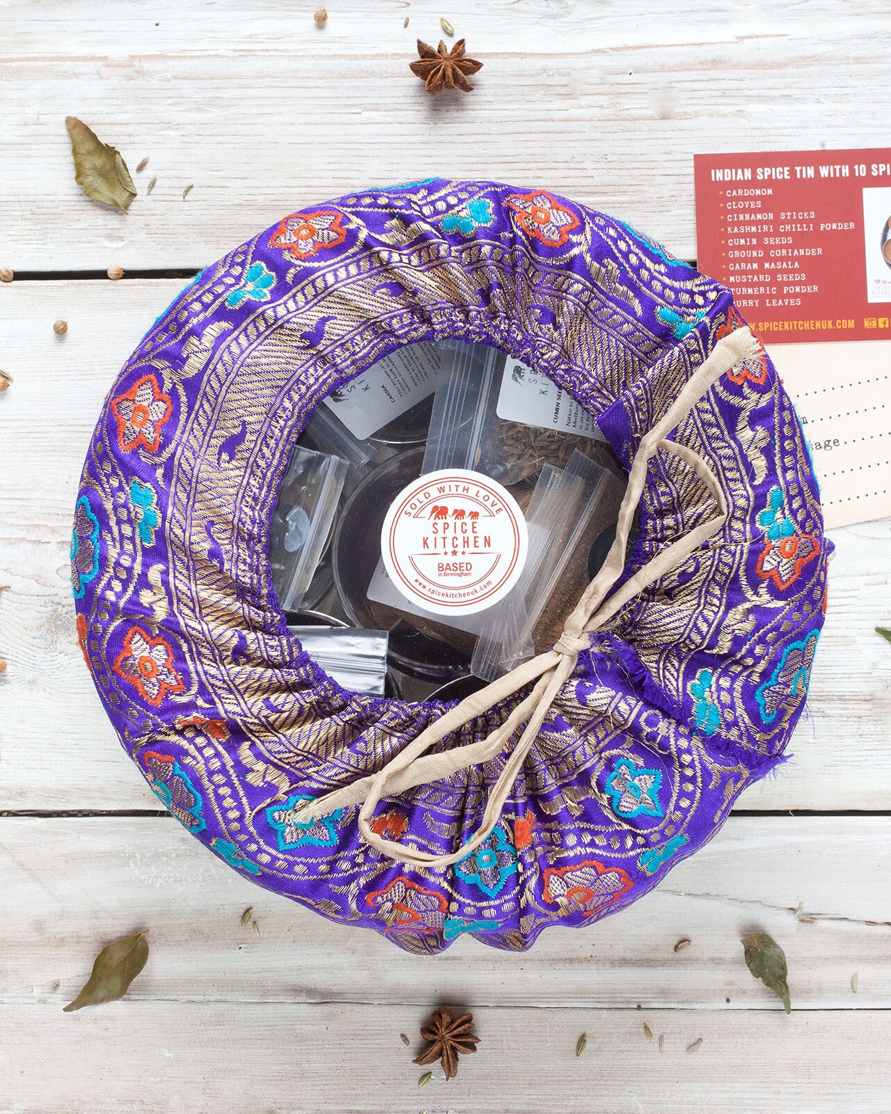 Beautifully presented Indian spice tin with Perspex lid, 7 removable spice pots and a small metal spoon, all wrapped in a handmade silk sari wrap (colour may vary). Contains: Garam Masala; Chilli Powder; Cumin Seeds; Ground Coriander; Mustard Seeds; Turmeric Powder; and Cardamom Pods, Cloves, and Cassia. Stainless steel tin size: 8 x 19cm