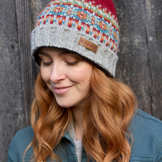The Iona range is made using traditional fair isle patterns. The colours will always be the same but the sequence of the pattern may change depending on the knitter, making each piece unique. 100% wool, knitted by hand in Nepal.
