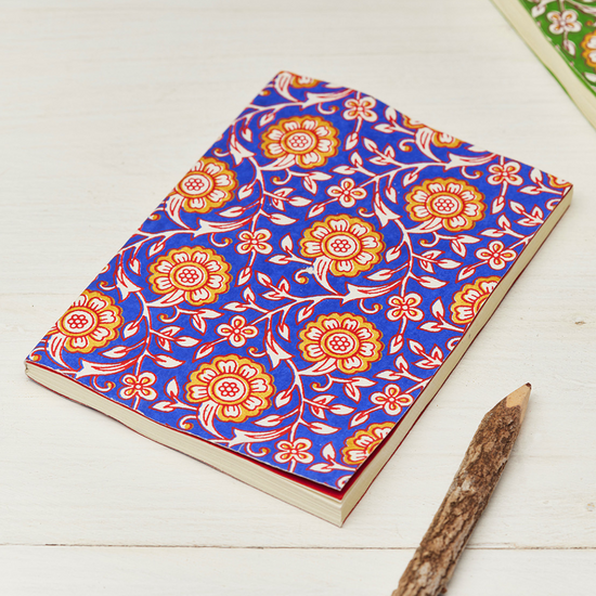 The beautiful hand crafted Jasmi notebook is eco friendly and sustainable. Flexibly bound, the strong recycled paper leaves are covered in bold blue or green Jasmi floral block printing. A convenient size, it is filled with plain recycled paper plain leaves making a practical and appealing stationery gift.