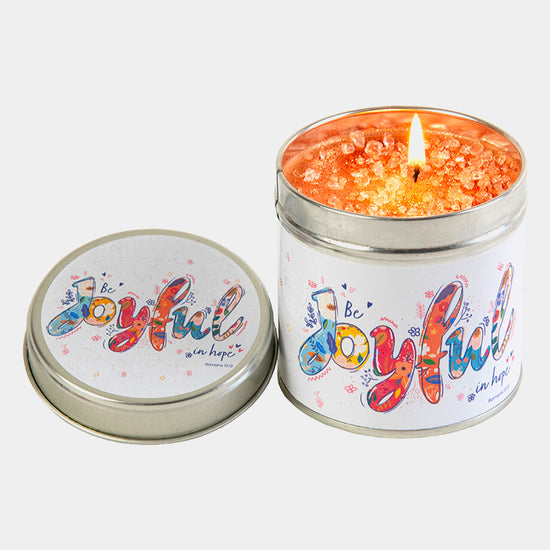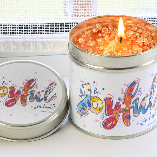 Exclusive Joyful in Hope Candle Tin with a fruity Orange Blossom and Rhubarb scent. Suitable for vegans. biodegradable glitter topping. Approximate burn time 50 hours. Size 8 x 8cms.