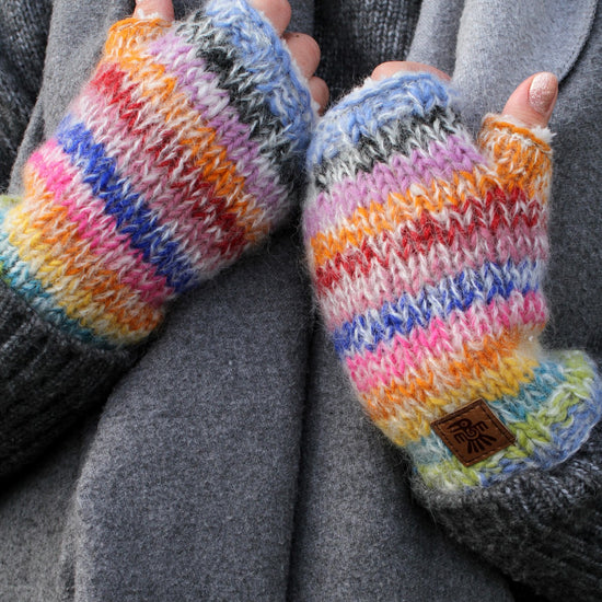 Inspired by the vibrant city of San Francisco, this rainbow design will brighten up any dreary day. Fluffy wool/ mohair mix lined with soft sherpa fleece. Fair Trade & handmade in Nepal.