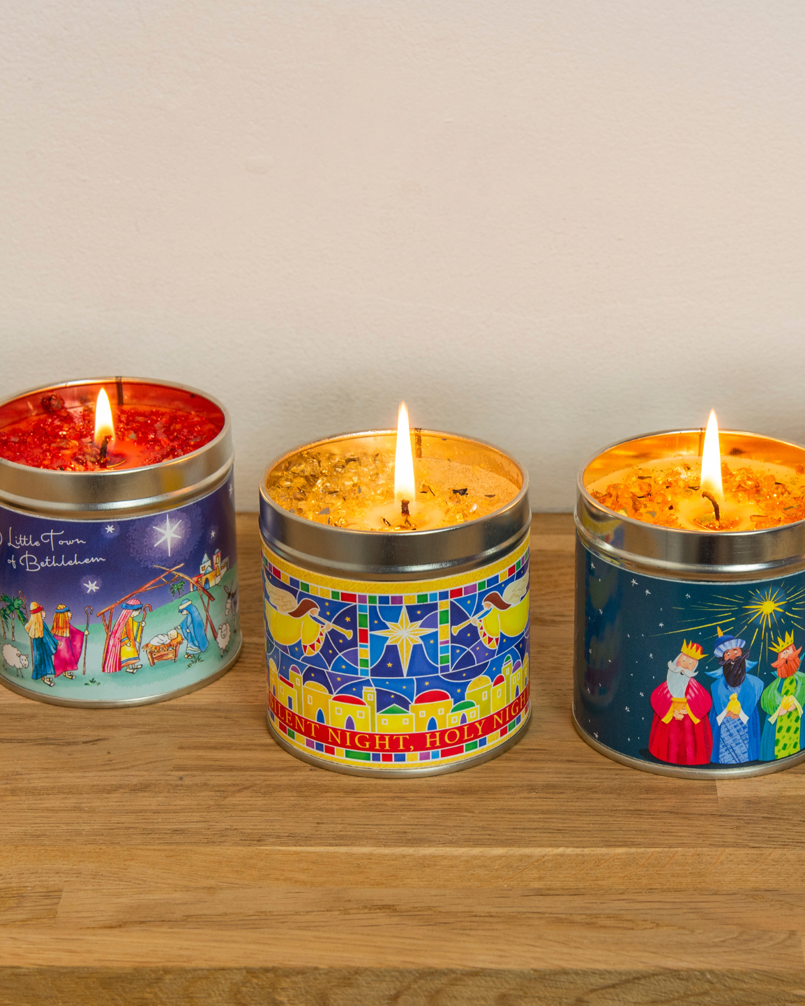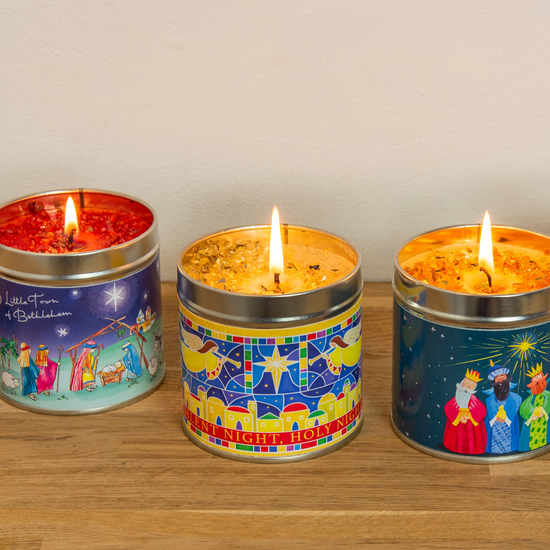 This Little Town of Bethlehem candle tin is scented with a delightful festive fragrance. Each candle is topped with biodegradable glitter and presented inside a silver-coloured tin with festive wrap design. Light each evening and use in conjunction with the matching Advent calendar. Approx. burn time 50 hours. Size: 8 x 8cm. Coordinates with Advent and Christmas cards.