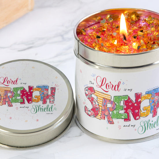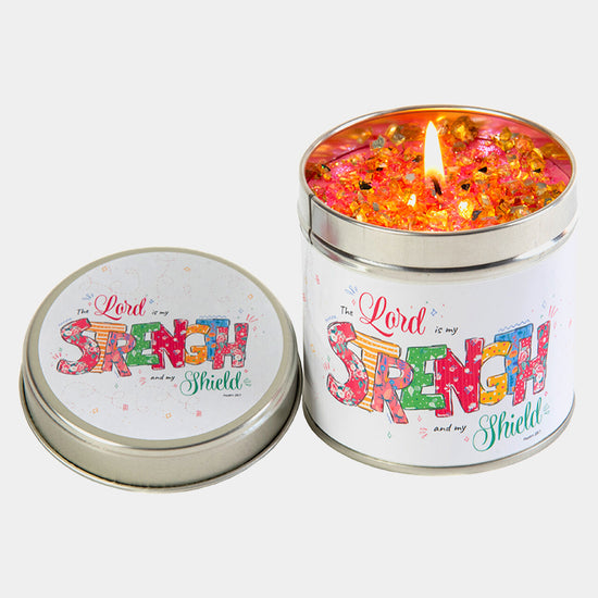 Exclusive Lord is my Strength Candle Tin with a floral Sweet Pea scent. Suitable for vegans. biodegradable glitter topping. Approximate burn time 50 hours. Size 8 x 8cms.