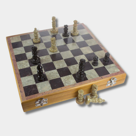 Handmade Wooden Chess Box with Soapstone Board and Pieces