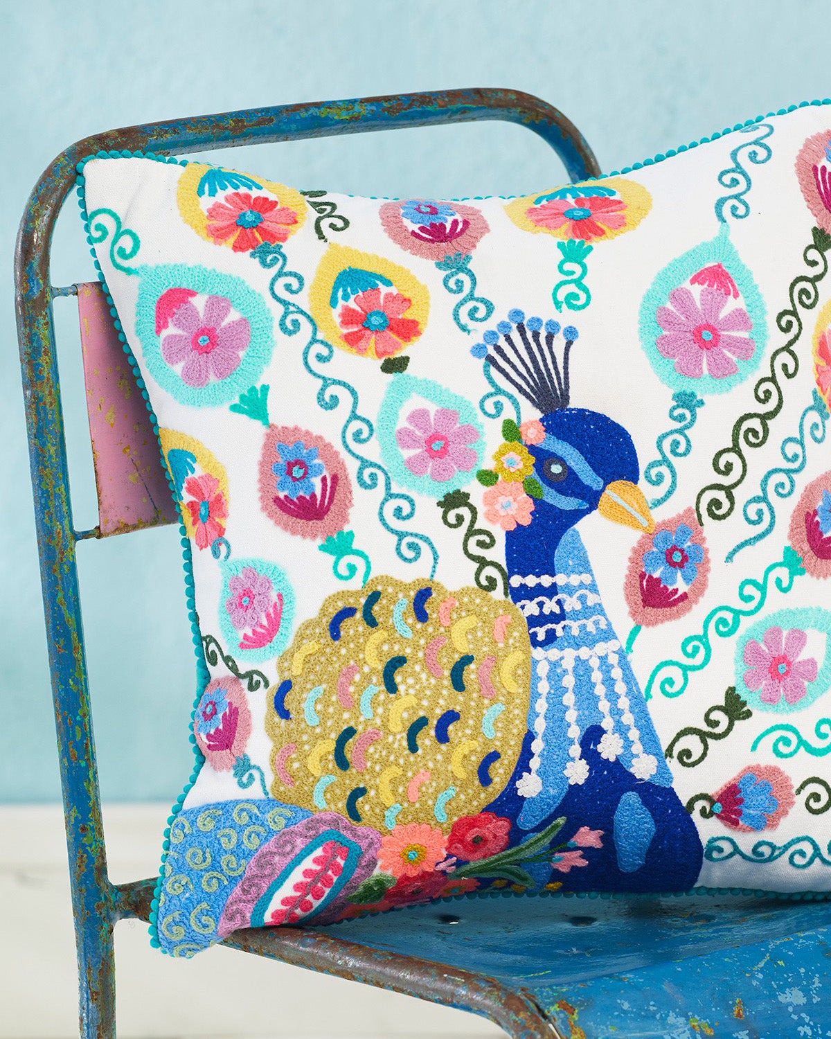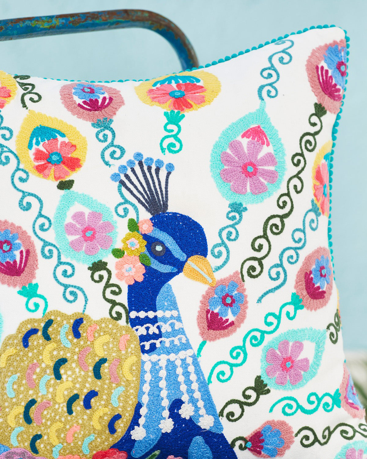 A majestic embroidered peacock peers out from the front panel of this decorative square cushion cover emblazoned with scrolled feather motifs.