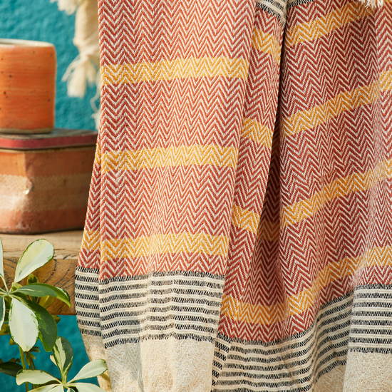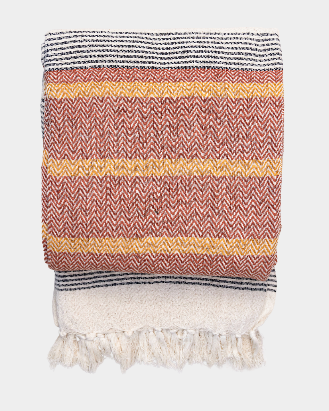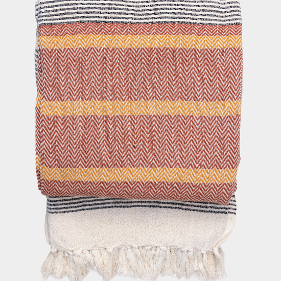 A hand crafted cotton bed cover, with tassel edge detailing and woven finish in terracotta and caramel stripes. The subtle herringbone weave is perfect for dressing a bed with rustic charm.
