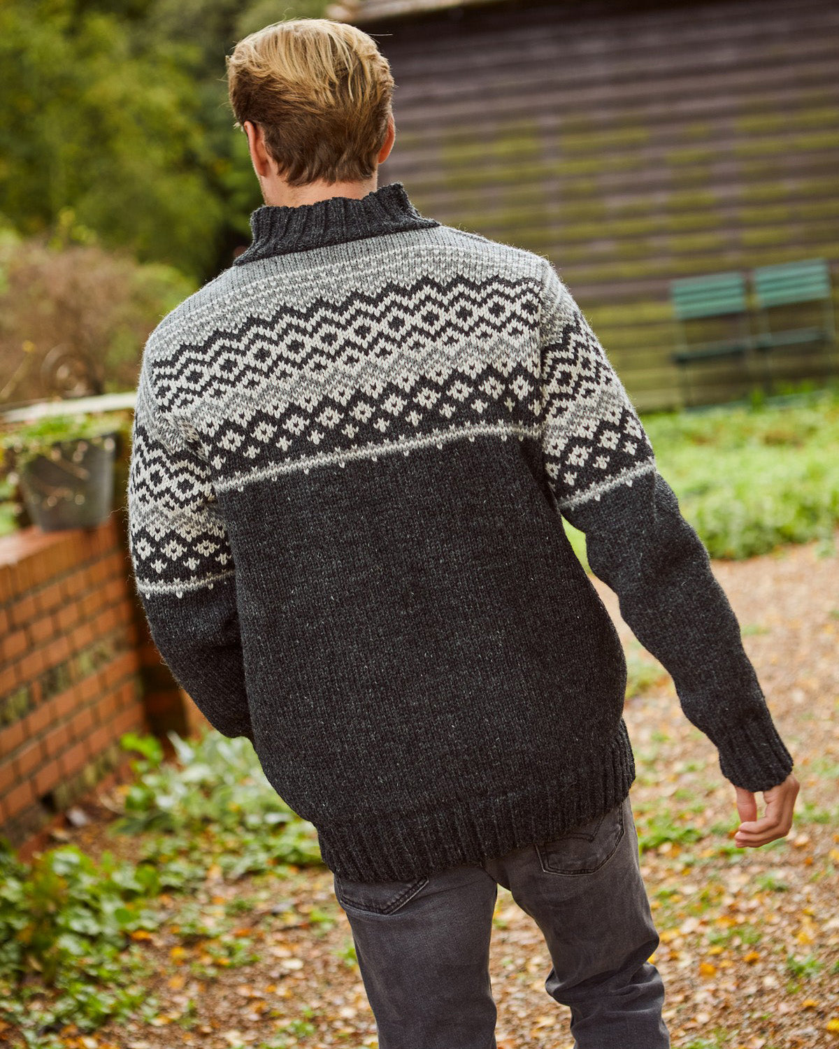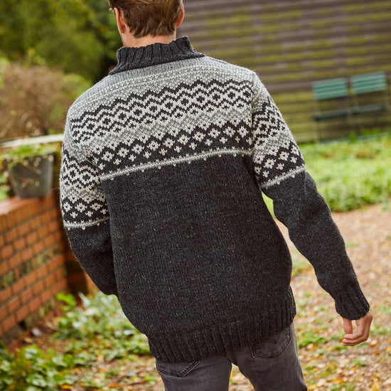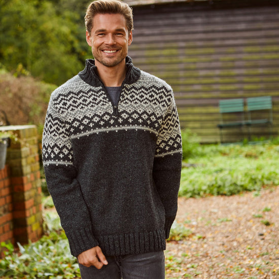 Fair Trade and handmade in Nepal. Jorvik Half Zip Charcoal Sweater. Stay warm and stylish with this simple yet sophisticated fair isle design. Pachamama's cosy half zip jumper is designed to keep you warm while ensuring you look great. These sweaters are unlined making it perfect for layering underneath, but fleece lined around the collar to keep you comfortable.
