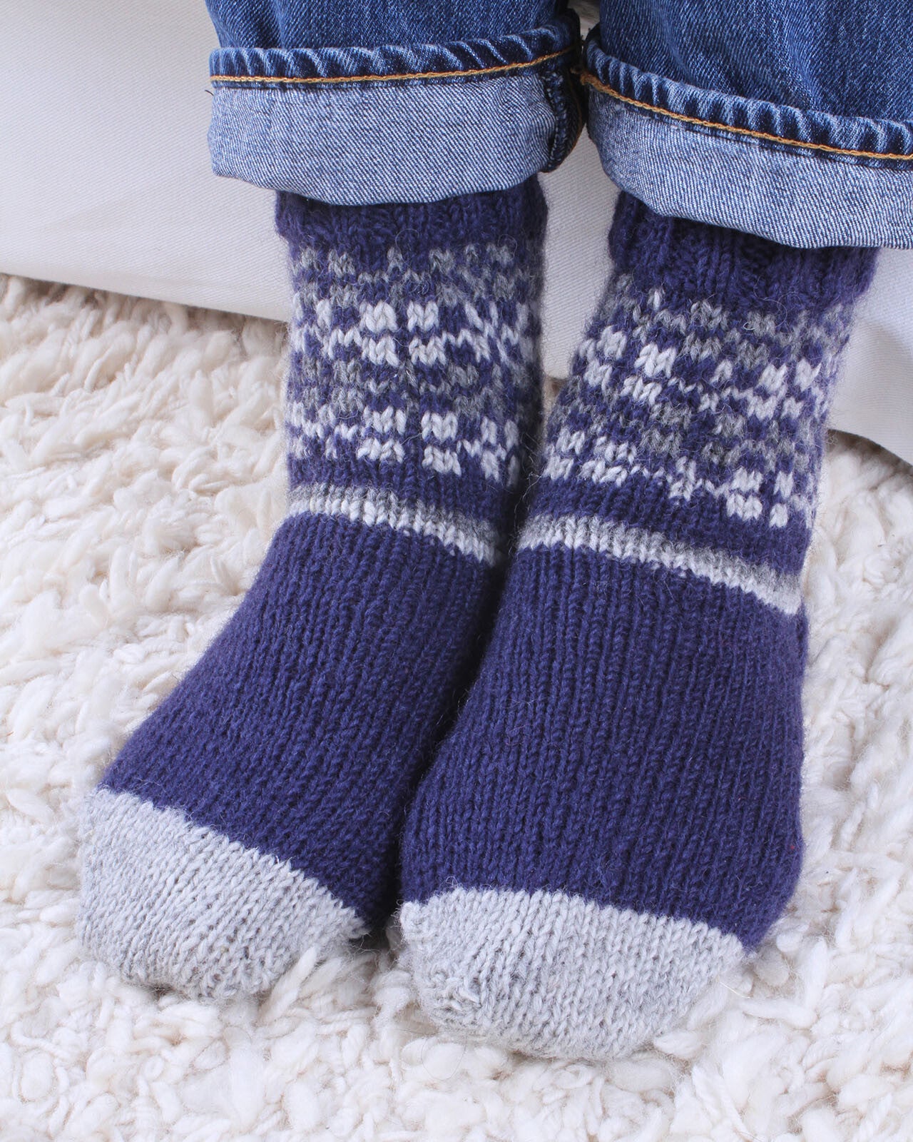 Men's Rosslare, simple fairisle sofa socks beautifully handknitted in our finer wool yarn. These sofa socks have a bit of colour, a bit of pattern and are a great shape. An all-round winner! Pachamama Men's hand knitted comfy warm wool socks, fine knit socks for lounging, fair trade and handmade in Nepal.100% wool Unlined. Made in Nepal