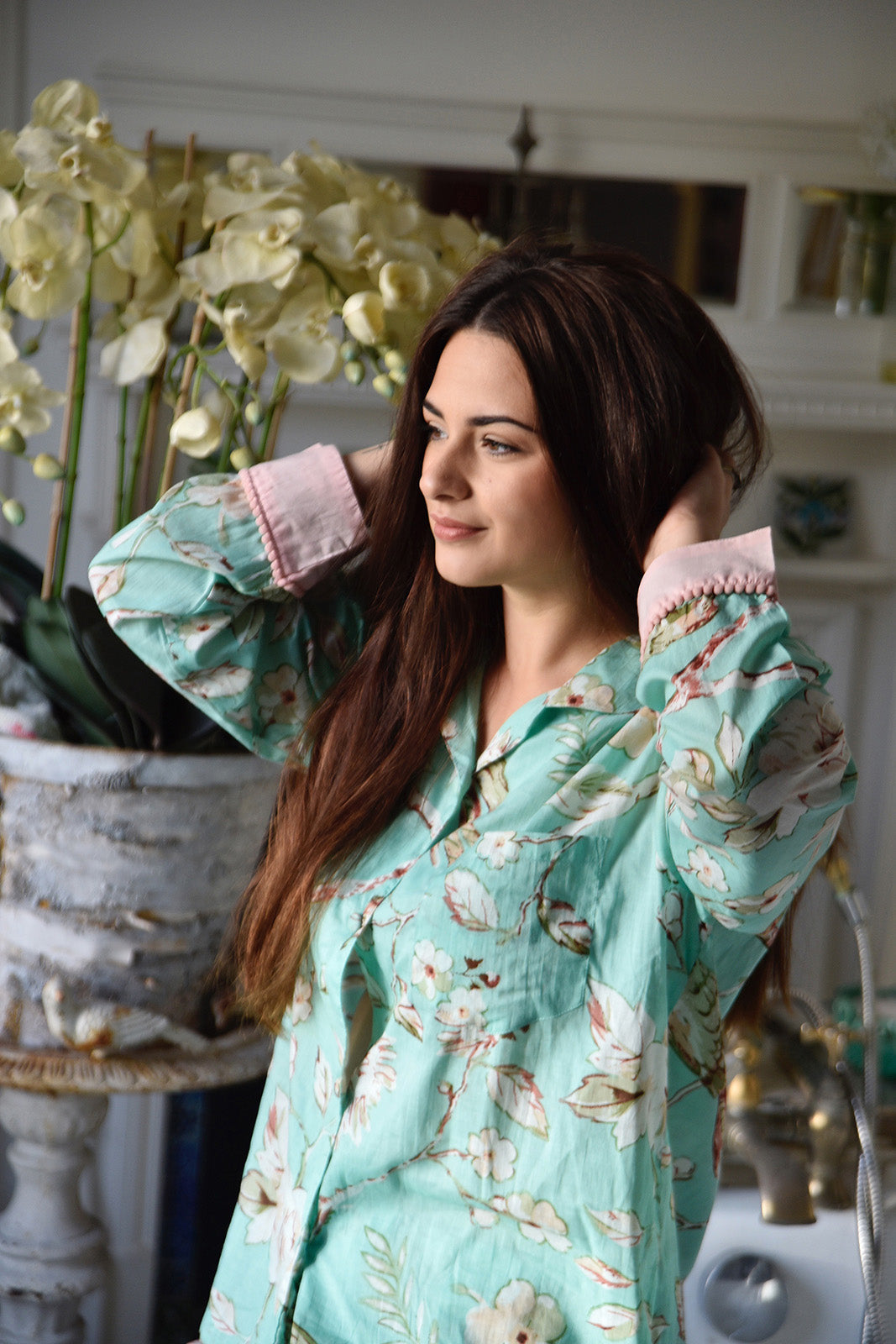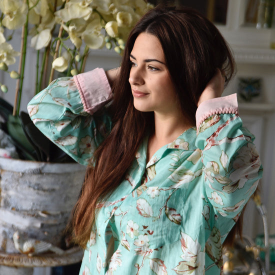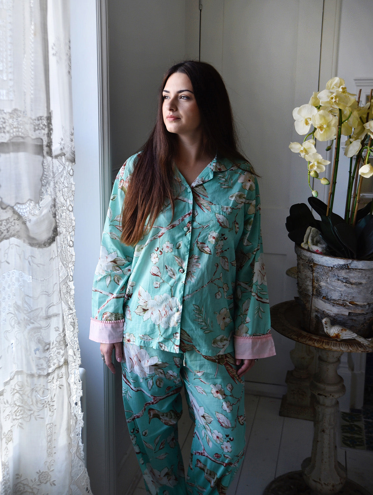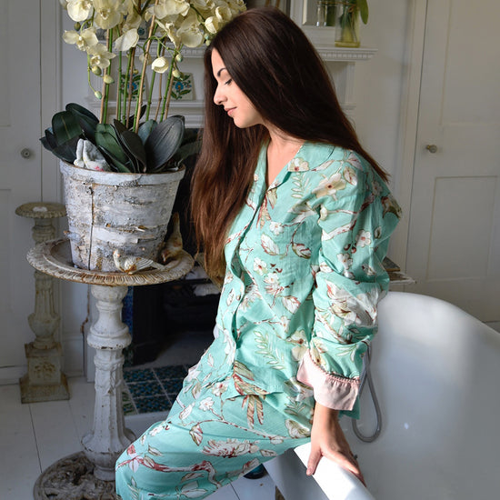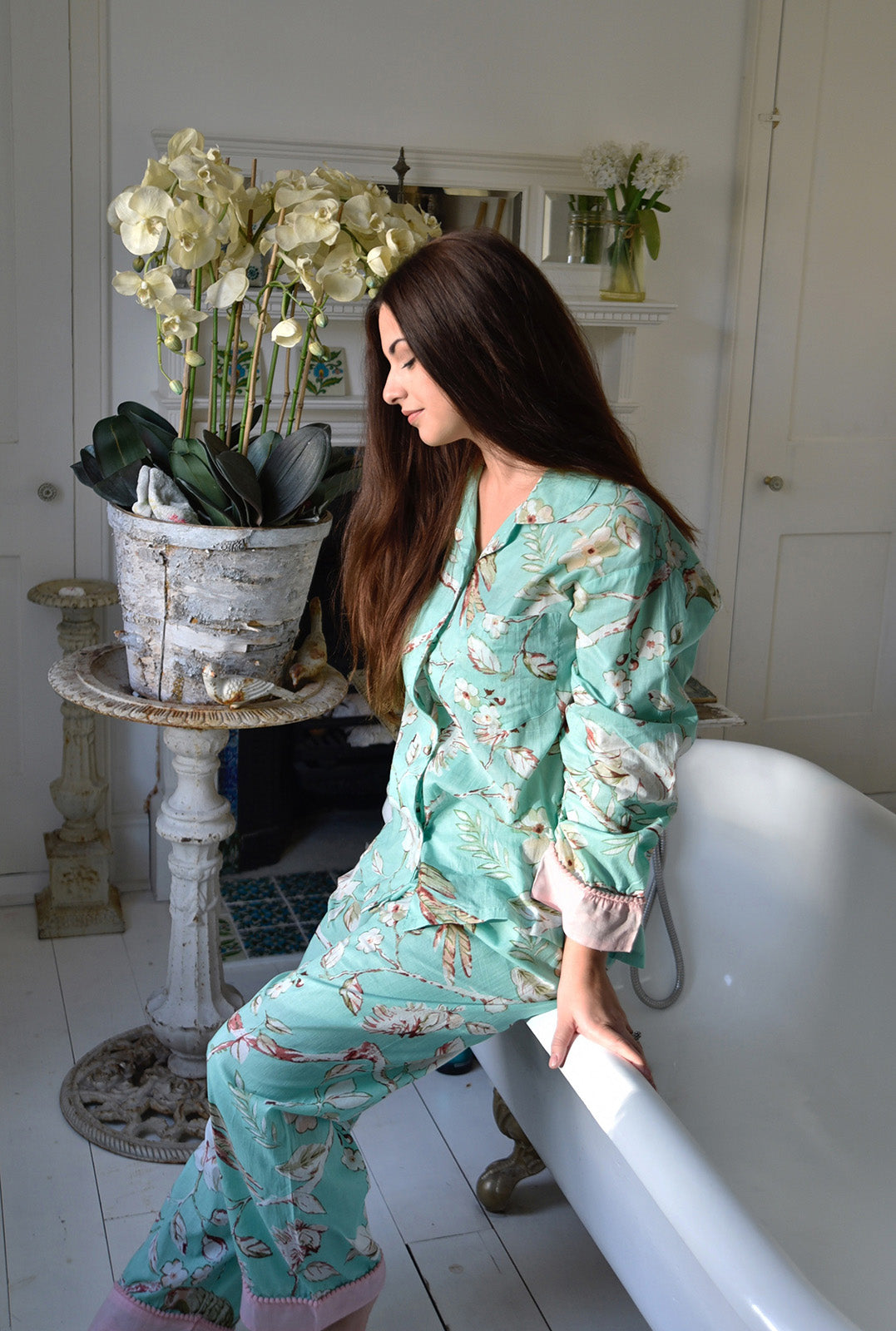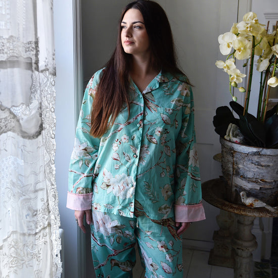 Lightweight and comfortable with feminine pink trims of small pom-poms. The pyjama jacket fastens with fabric-covered buttons and has a single breast pocket, and the trousers have a drawstring waist for comfort. 100% cotton fabric featuring birds with soft green plumes sitting on branches budding into cream blooms against a pale mint background. Made in India, Powell Craft.
