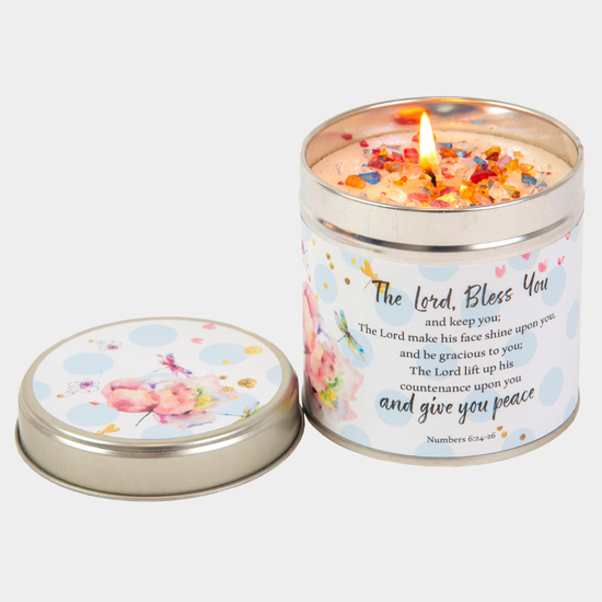 The Lord Bless you and keep you... The Numbers Blessing is a much loved verse suitable for many occasions. Handmade in the UK using a premium blend of mineral and vegetable waxes. Suitable for vegans. Biodegradable glitter topping. Clean cotton scent containing notes of Bergamot, Citrus, Neroli, and Sandalwood. Bible text: Numbers 6:24-26 (W.E.B.). Approx. burn time 50 hours. Size: 8x8cm