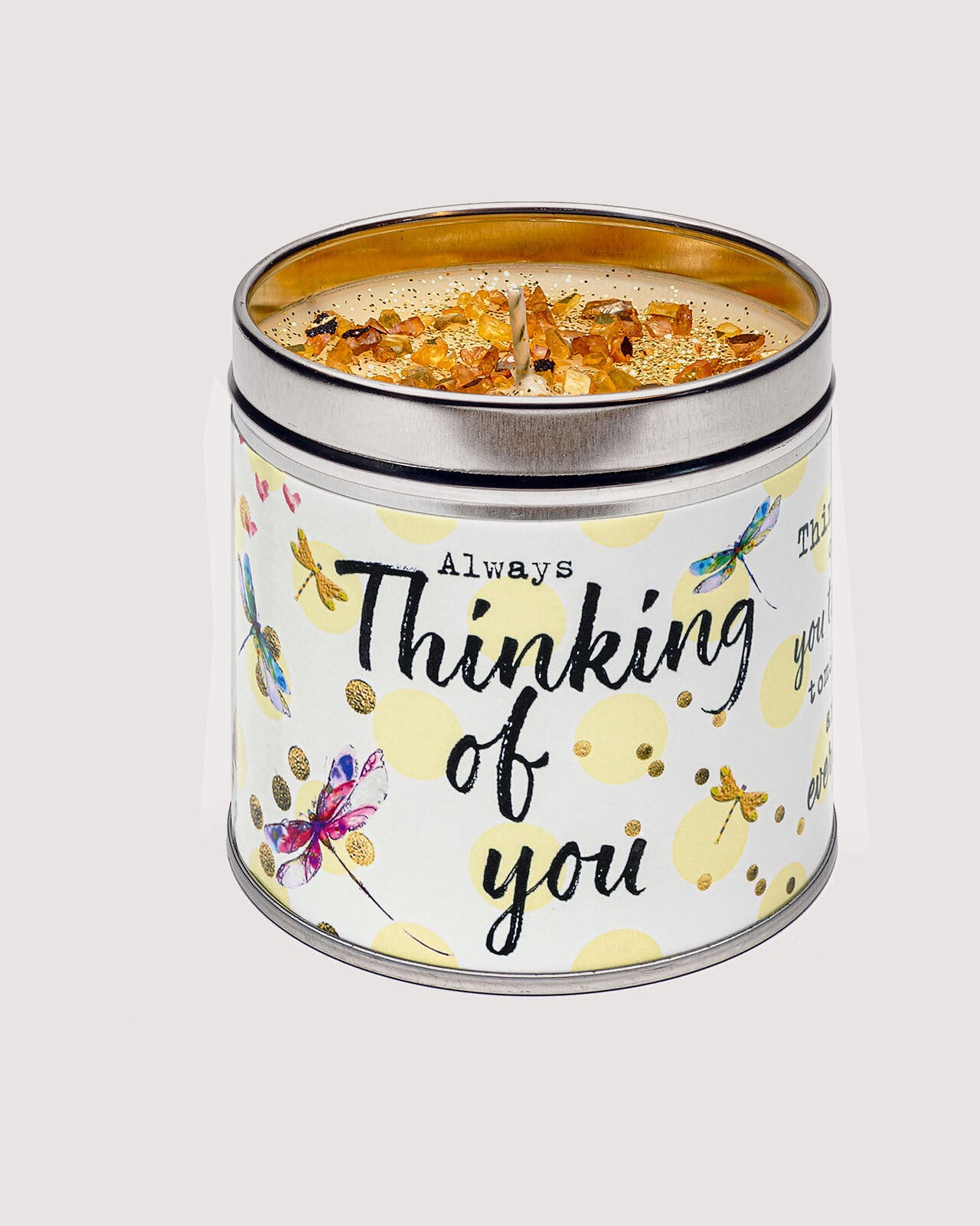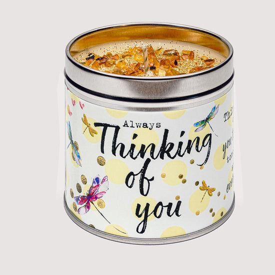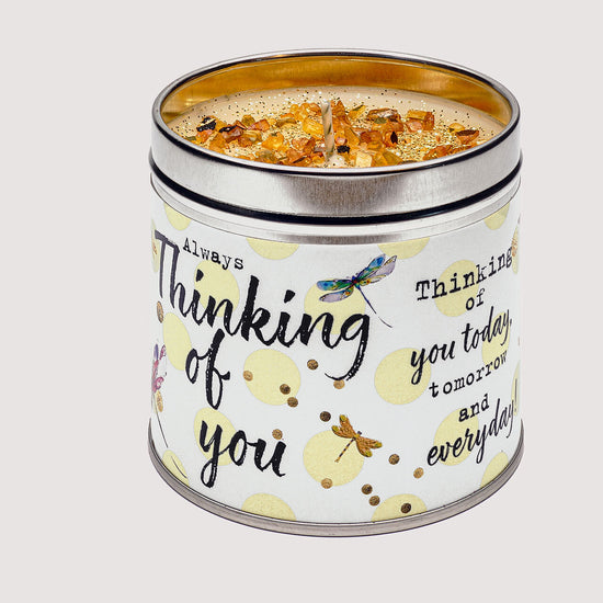 Just Because... Thinking of You Candle Tin. Classic cotton fragrance, crisp and clean scent: Bergamot, citrus, neroli, cyclamen and sandalwood.