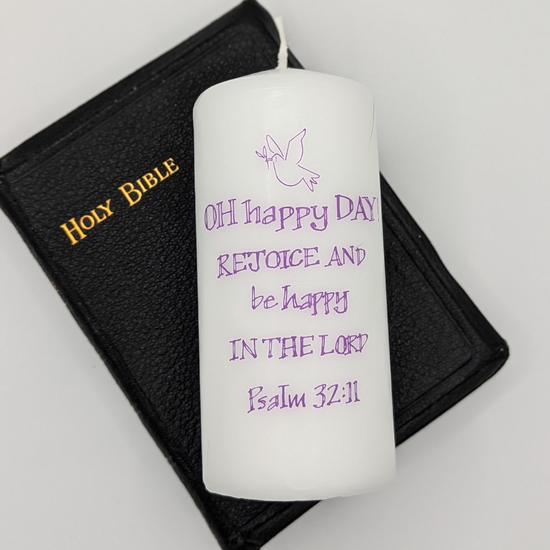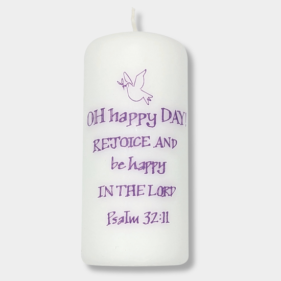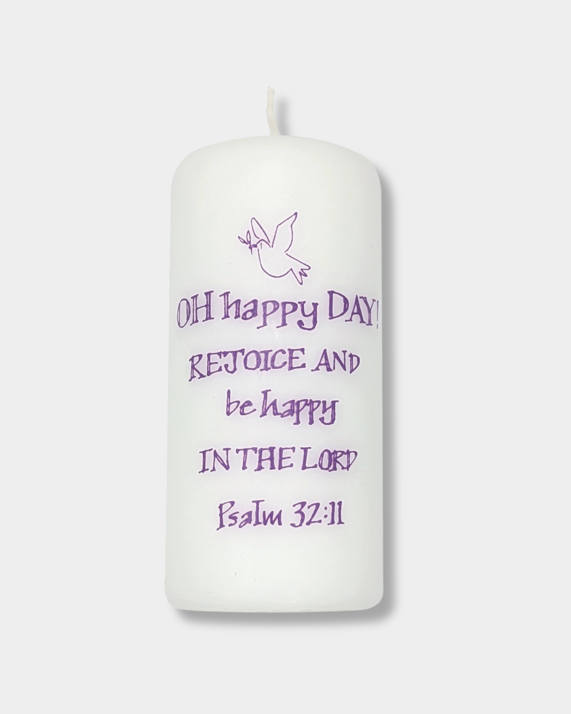 Handmade in the UK and inscribed with Oh happy day-Rejoice and be happy in the Lord. Psalm 32:11 alongside a delicate dove motif. Its a perfect addition for those needing a bit of spiritual sunshine, as this candle adds a spot of joy and hope for your home.