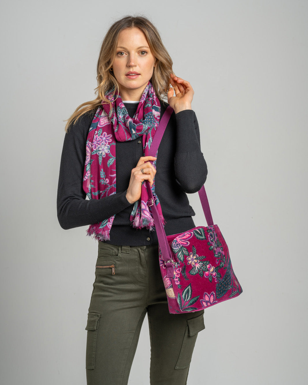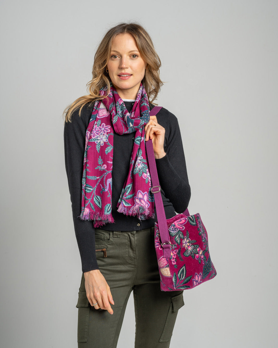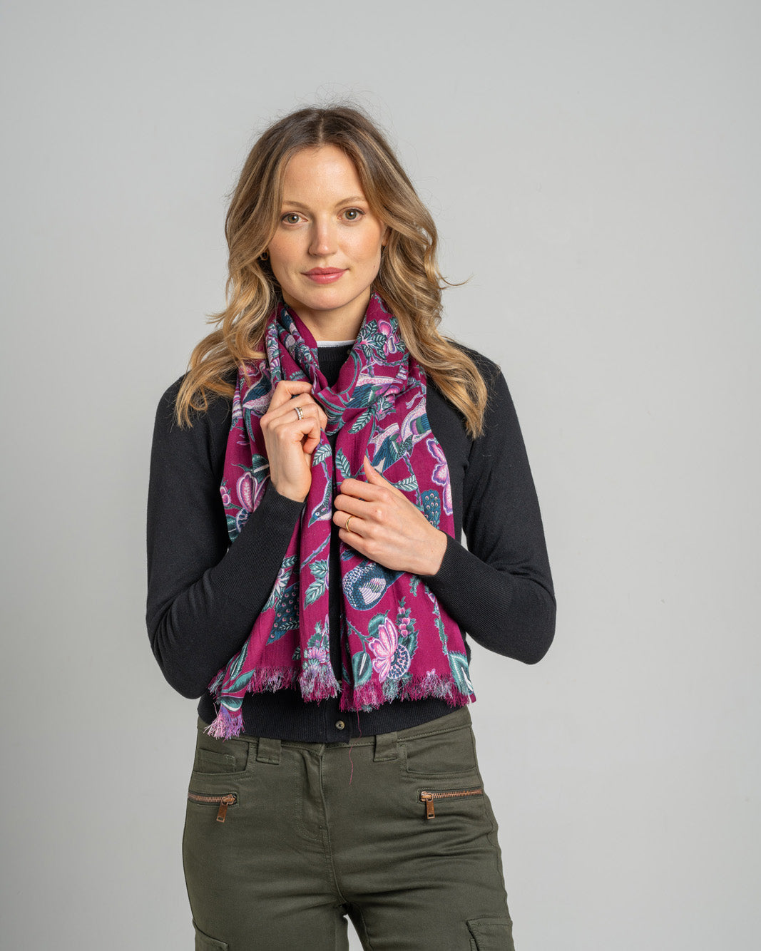 Stylish scarf in 100% viscose which is supersoft and drapes beautifully. Matching bag available. Size: 70 x 180cm.