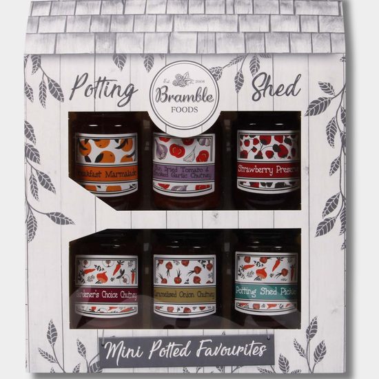 This gorgeous gift pack shaped like a potting shed contains a selection of Bramble Foods best-selling chutneys and preserves. Caramelised Onion Chutney, Potting Shed Pickle, Gardener’s Choice Chutney, Sun Dried Tomato & Smoked Garlic Chutney, Strawberry Preserve and Breakfast Marmalade, all presented in a stylish gift box. A delightful gift for any occasion, made with the finest ingredients to vegan-friendly recipes.