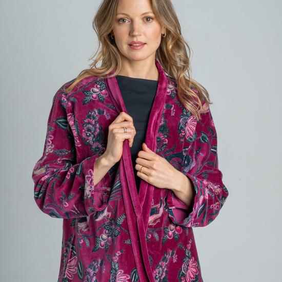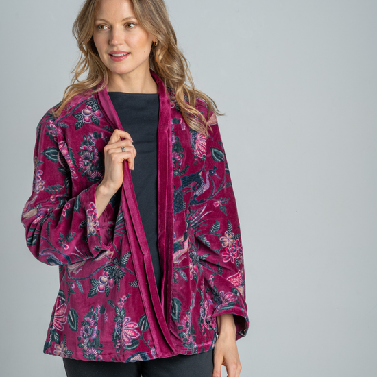 Relaxed fit velvet jacket in an exuberant botanical prints. The perfect way to dress up jeans or set off an outfit with a bold statement piece. Size: 70cm from collar to hem. Dry clean only. Fits UK size 8-14.