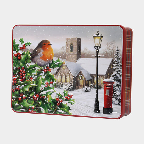 Chocolate chip and shortcake swirls, 300g. In a beautifully designed Winter Robin keepsake tin.