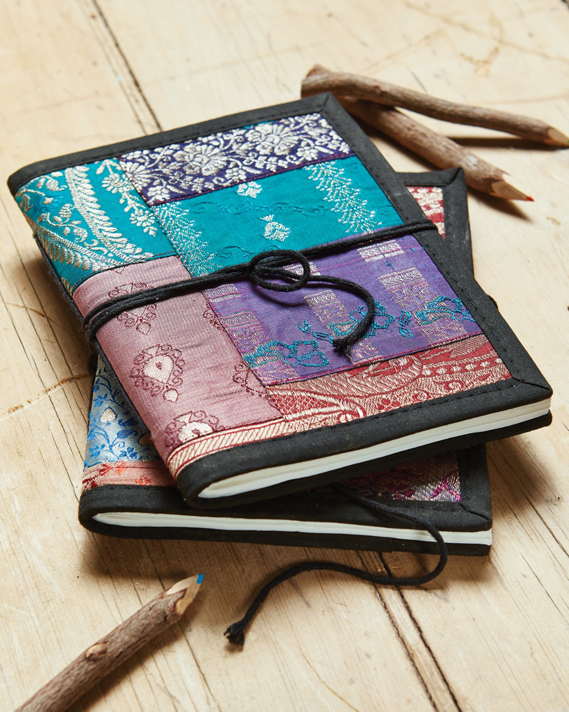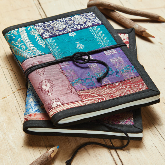 A beautifully bound notebook with handmade paper from recycled cotton. Covered with recycled sari fabrics so each one is different and will vary from the image shown. Handmade In India Size: 15 x 20cm.