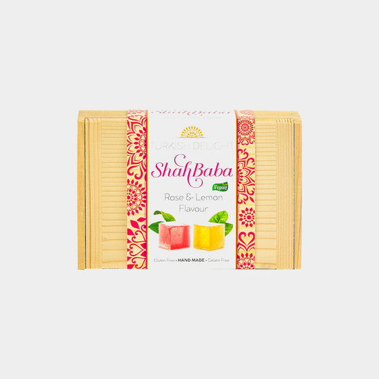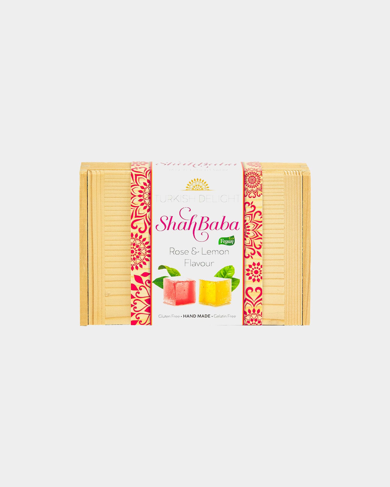 Delicious handmade roses and lemon flavour Turkish Delight in a wooden gift box. Gluten and Gelatin free. Suitable for vegans. 227g