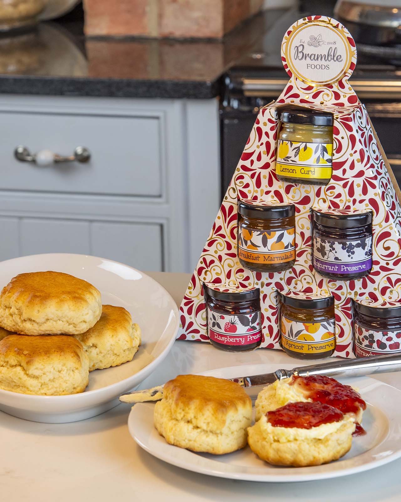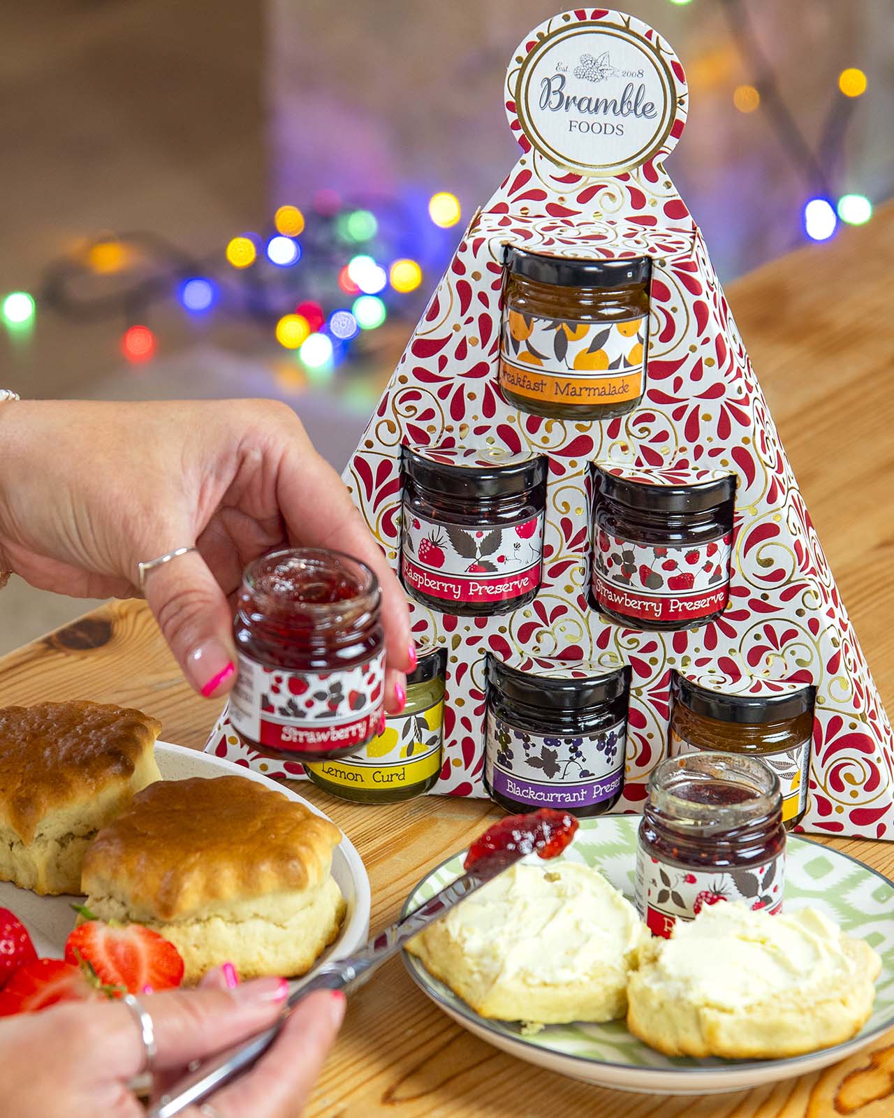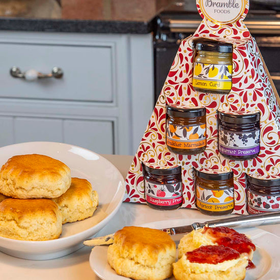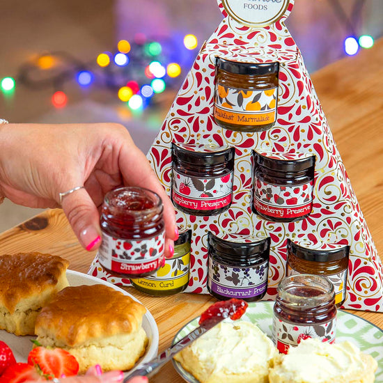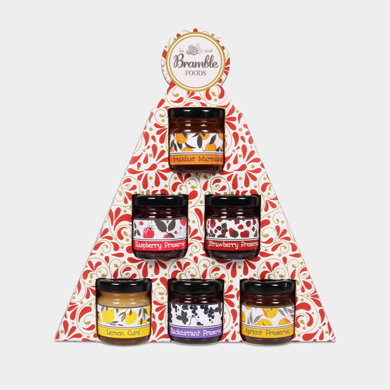 6 dinky jars of Bramble Foods jams, marmalades and lemon curd. All packaged in a fun Christmas box.