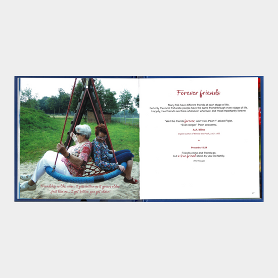 This delightful gift book reminds us that close friends are a special blessing from God. They are the family we choose for ourselves - they make our world a happier place to be. Includes warm-hearted quips, quotes, Bible verses and thoughts for the day that celebrate the joys of friendship.