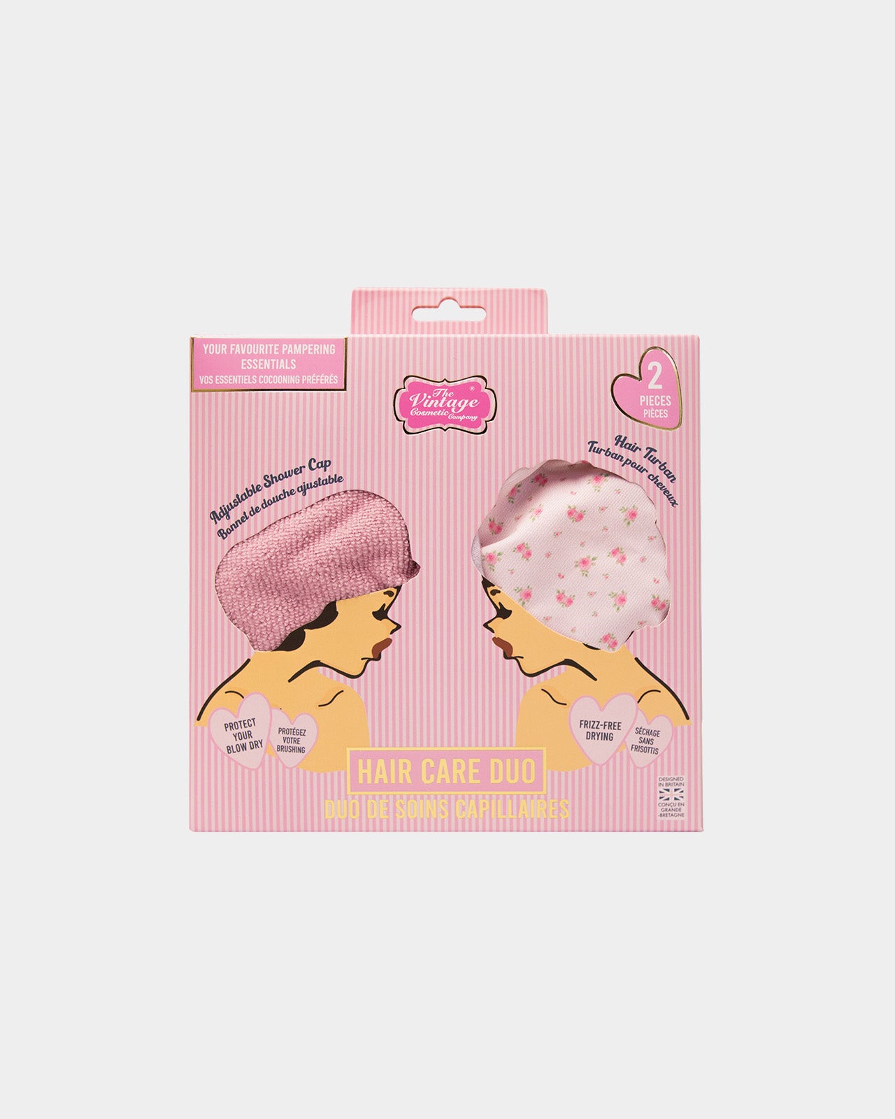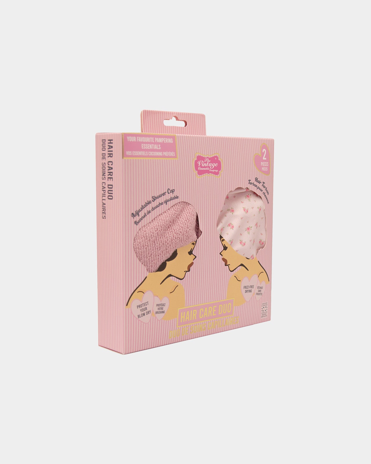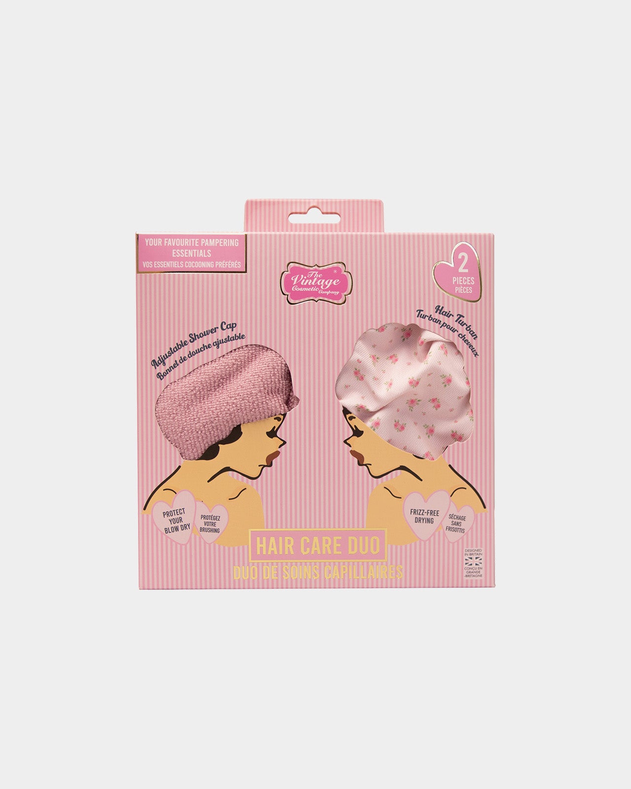 Embrace 1950’s glamour with this vintage rose set. The lined waterproof shower cap will keep your hair dry and frizz-free. The super absorbent towel turban soaks up moisture quickly and prevents