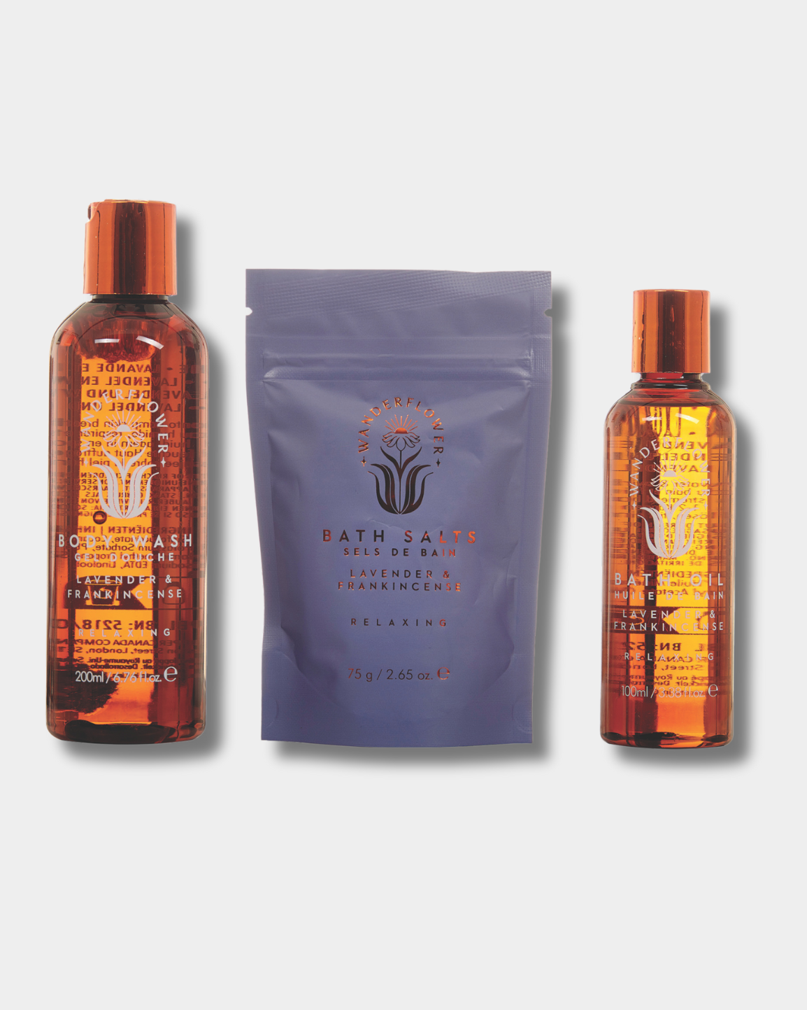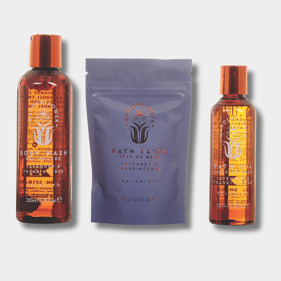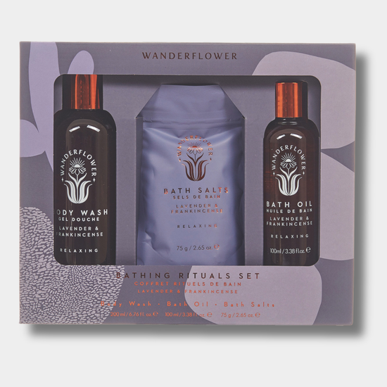 Wanderflower Bathing Rituals Set helps to encourage a moment of deep relaxation using the calming aromas of Lavender & Frankincense.