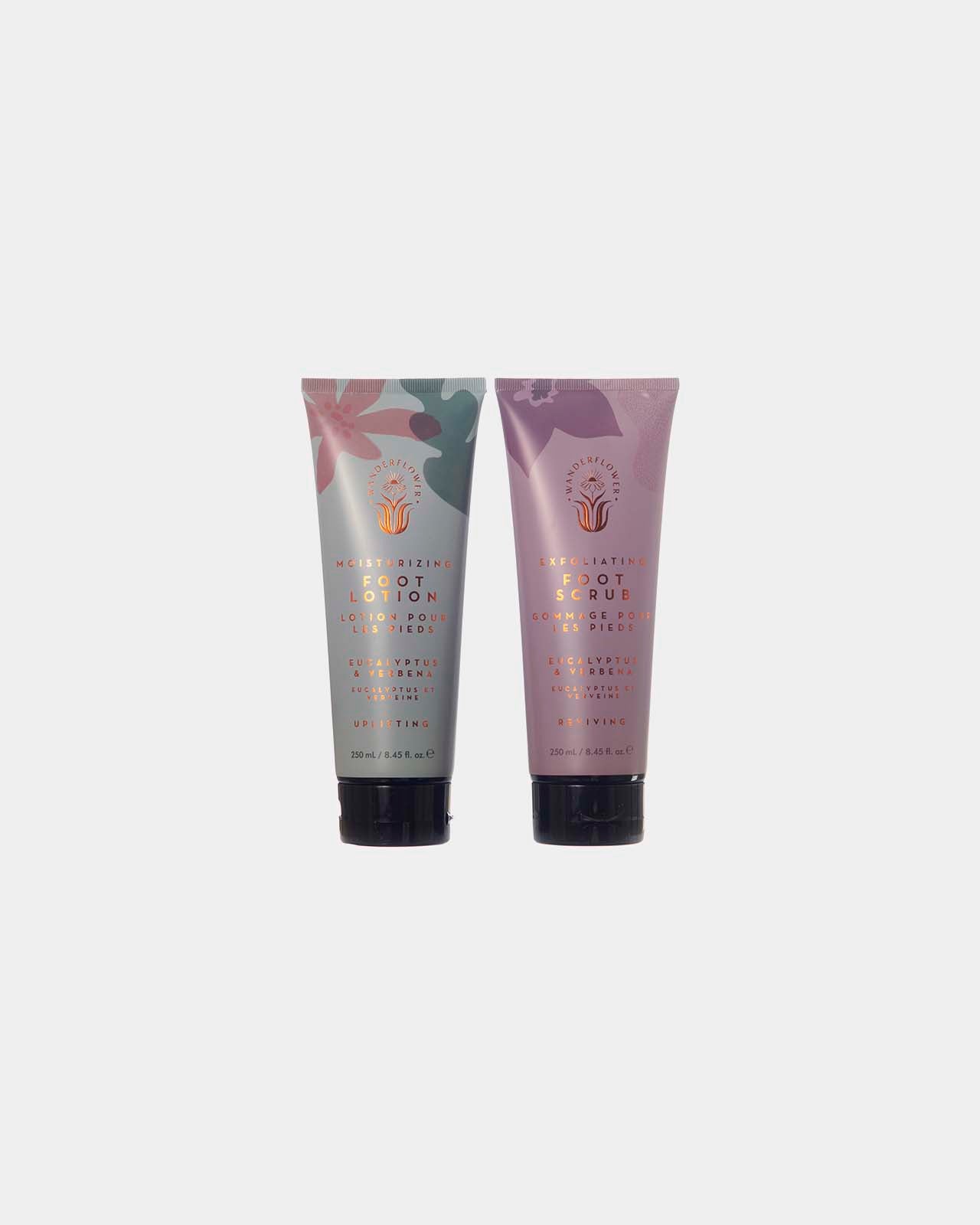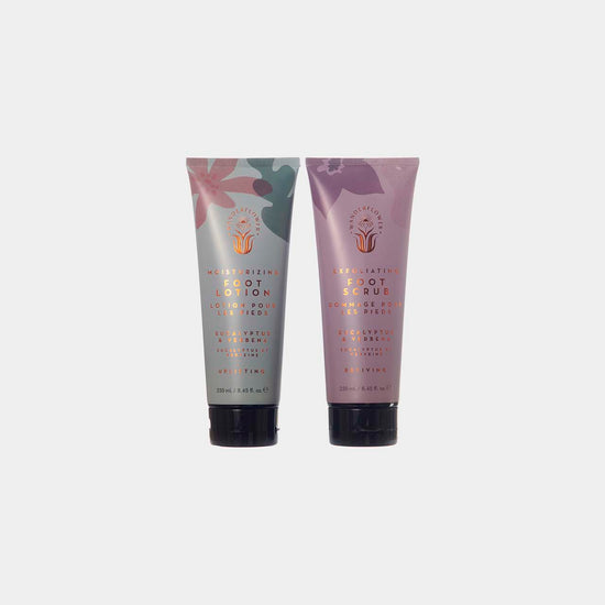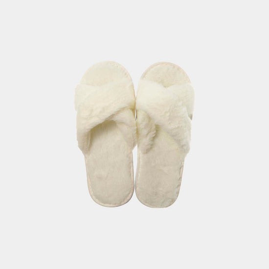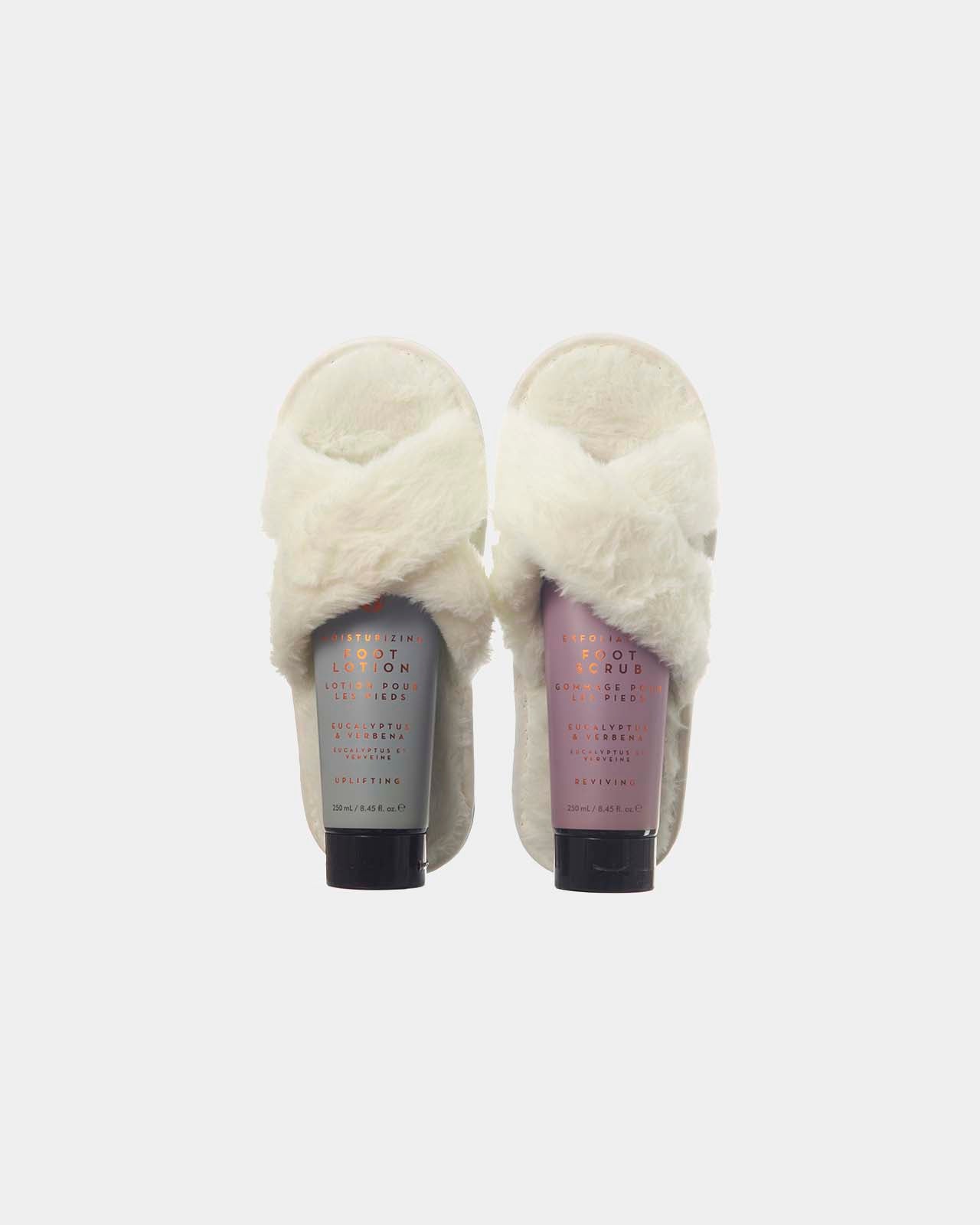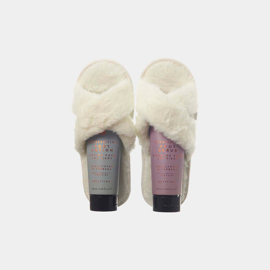 Gift boxed pair of plush, cream open-back mule slippers, crafted from soft faux fur fabric. Free size, to fit up to UK size 7, making them a versatile gift option. Includes two generous 250ml tubes of eucalyptus and verbena-scented foot scrub and lotion. Vegan-friendly, paraben-free, and SLS-free.