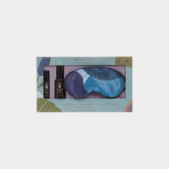 Drift off into relaxed sleep with this Wanderflower 'Sleep Well' Gift Box, infused with lavender and fig essential oils. Set contains: pillow spray 30ml; roller ball sleep well oil 10ml; and a silky feel eye mask.