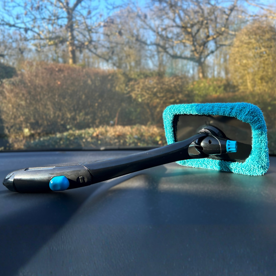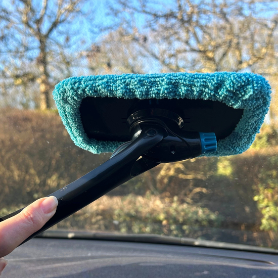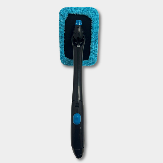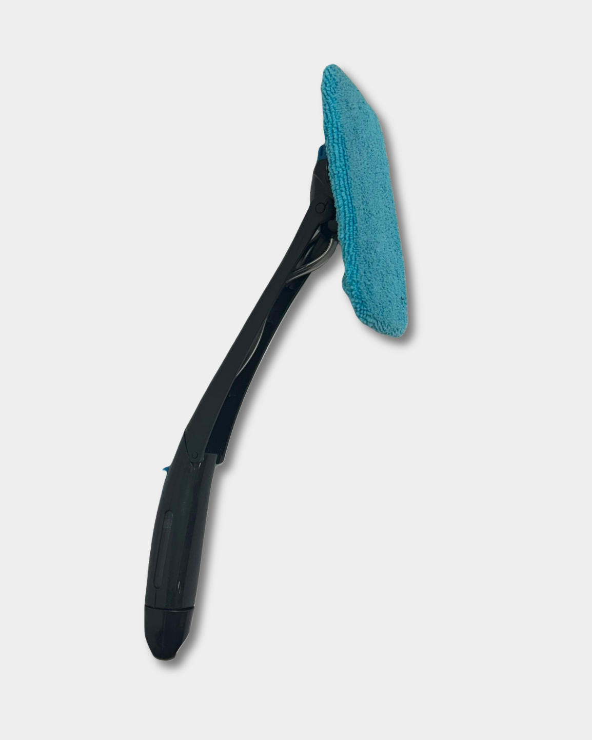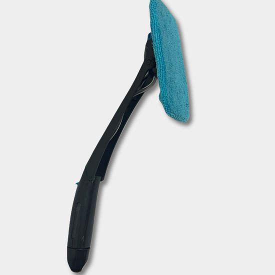 Spray and clean your windshield in minutes. With a pivoting head and 2 reusable microfiber bonnets it cleans the hardest to reach places. Folds for easy storage.